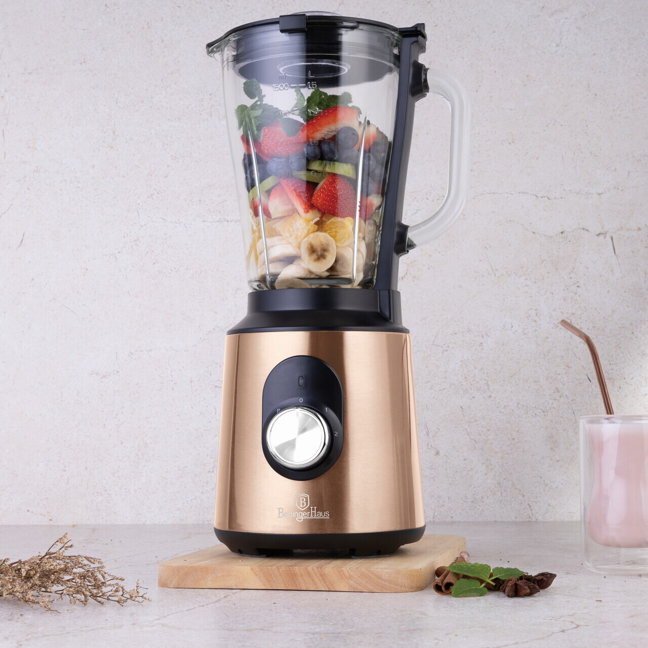 Blender de masa Berlinger Haus, Rose Gold, 1000W, 1.5 L, inox/sticla/plastic, roz/transparent