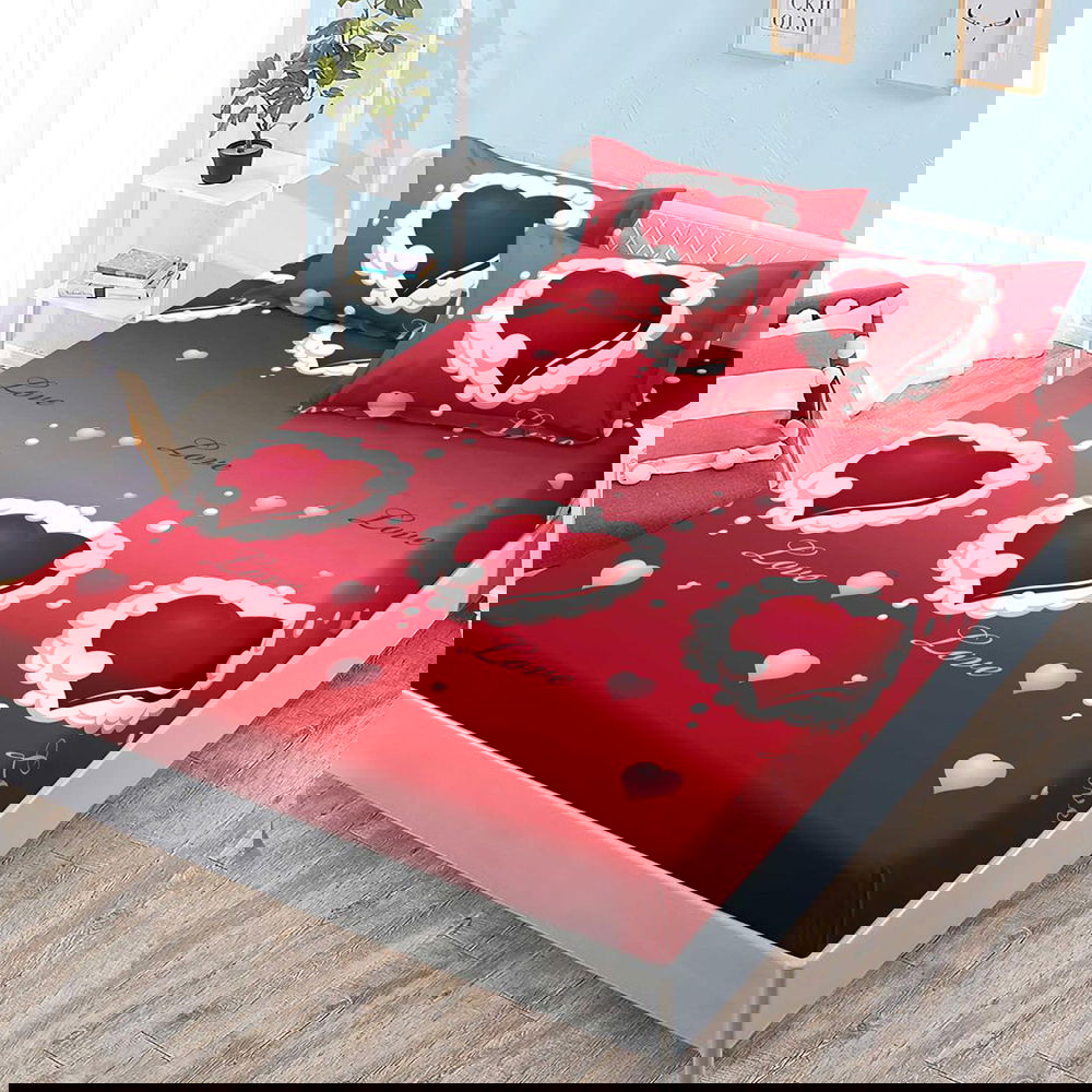 Cearceaf din Finet cu Elastic - 140/160x200 + 2 Fete Perna - Rosu Love - CEFS_K063B
