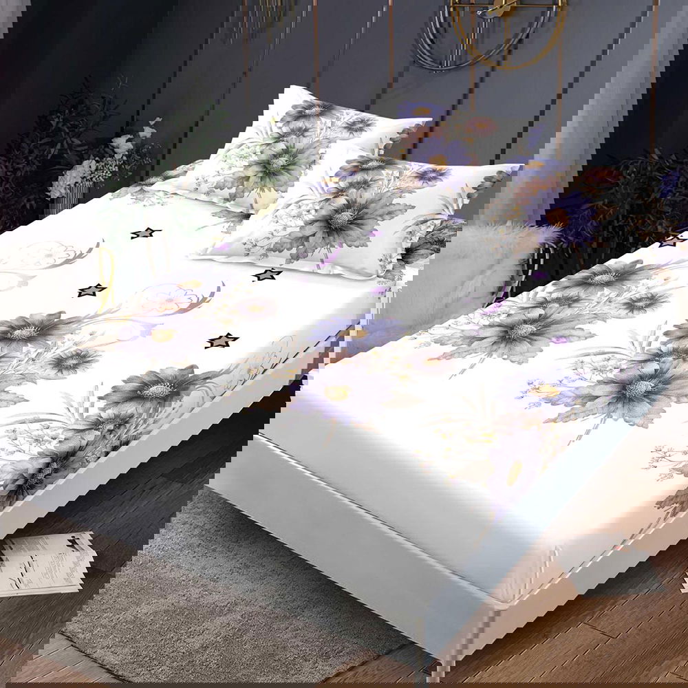 Cearceaf din Finet cu Elastic - 120/140x200 + 2 Fete Perna - Flori Lila - CEFS_M072