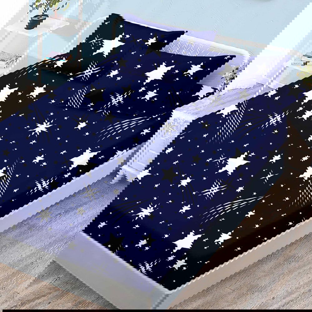 Cearceaf din Finet cu Elastic - 140/160x200 + 2 Fete Perna - Albastru Ploaie de Stele - CEFS_K061B