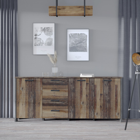Bufet cu 3 usi si 4 sertare Clif, Lemn Vintage si Beton Optic Gri Inchis, 206.1 x 86,3 x 41,6 Cm