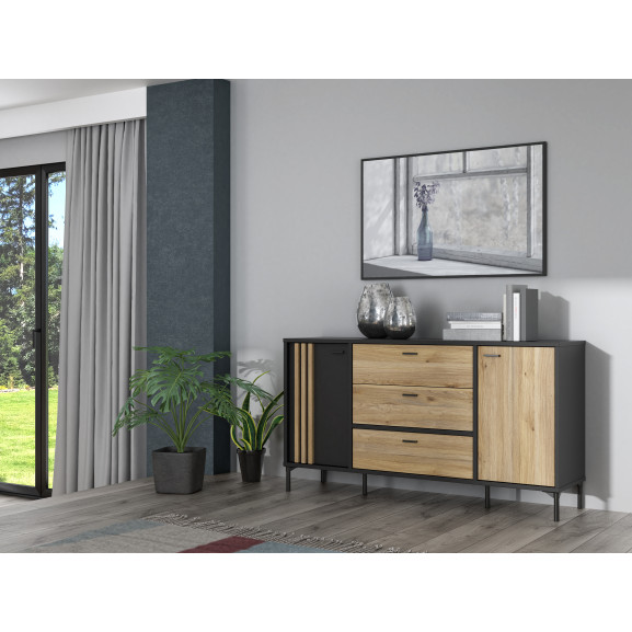 Bufet 2 Usi Si 3 Sertare Jeremix, Stejar Mauvella Si Negru Mat, 159.5 Cm