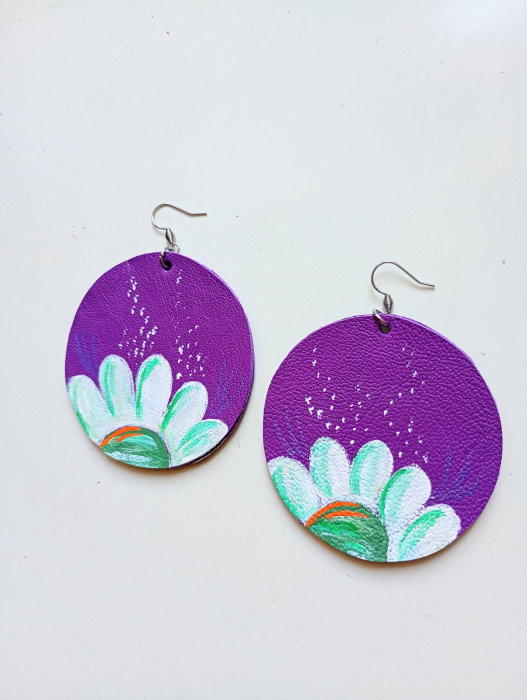 Cercei handmade mov supradimensionati cu crizanteme pictate,din piele naturala ,unicat