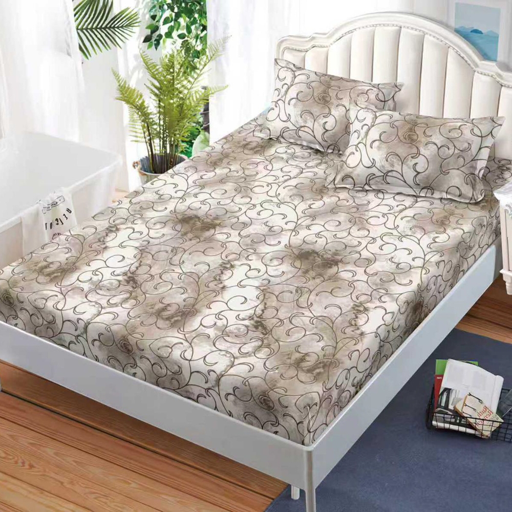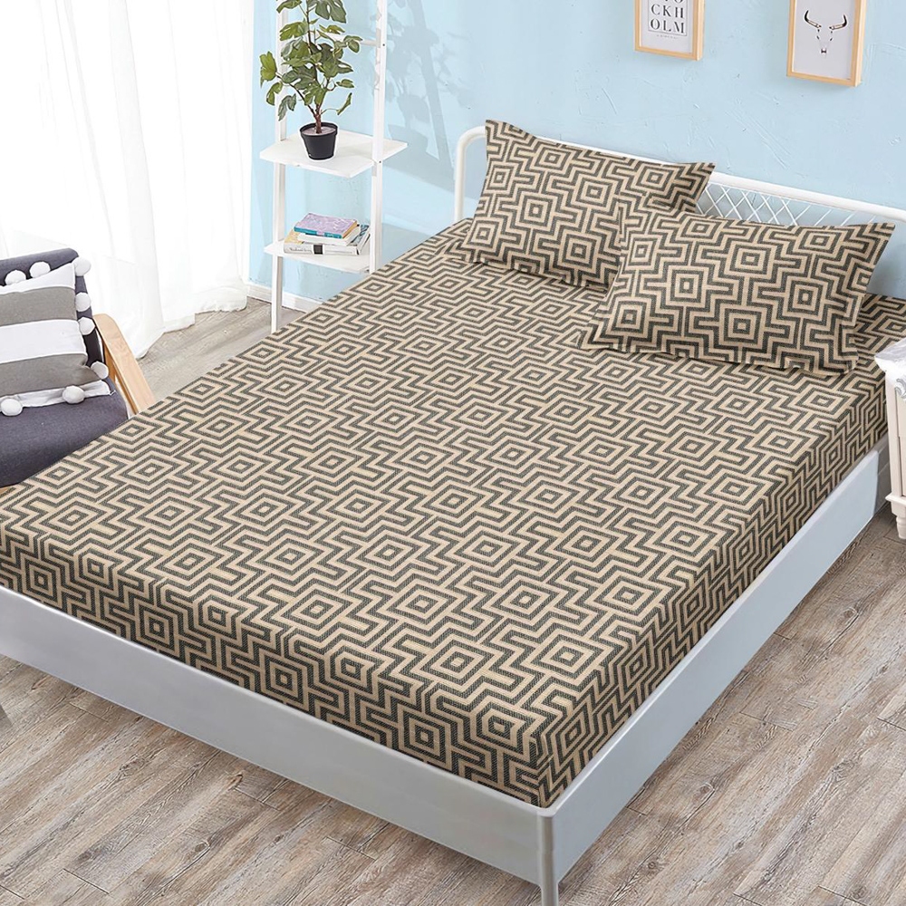Cearsaf cu Elastic, Bumbac Satinat, 160x200 cm + 2 Fete de Perna 50x70 cm, Bej, abstract