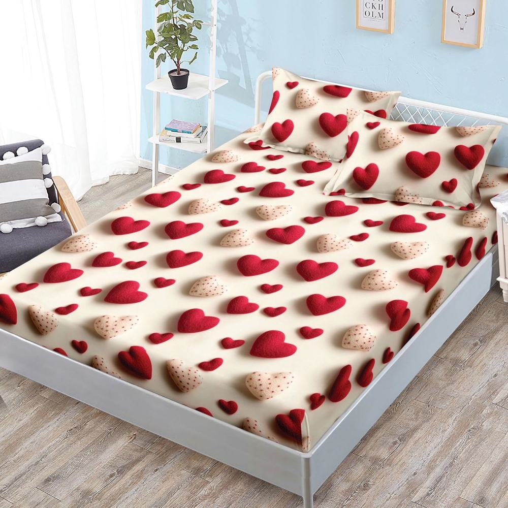 Cearsaf cu Elastic, Bumbac Satinat, 160x200 cm + 2 Fete de Perna 50x70 cm, Crem, inimioare