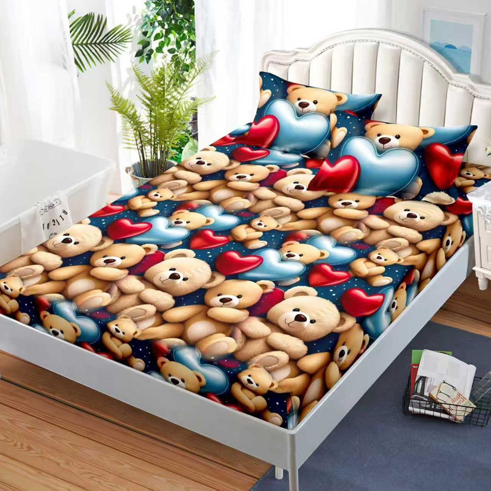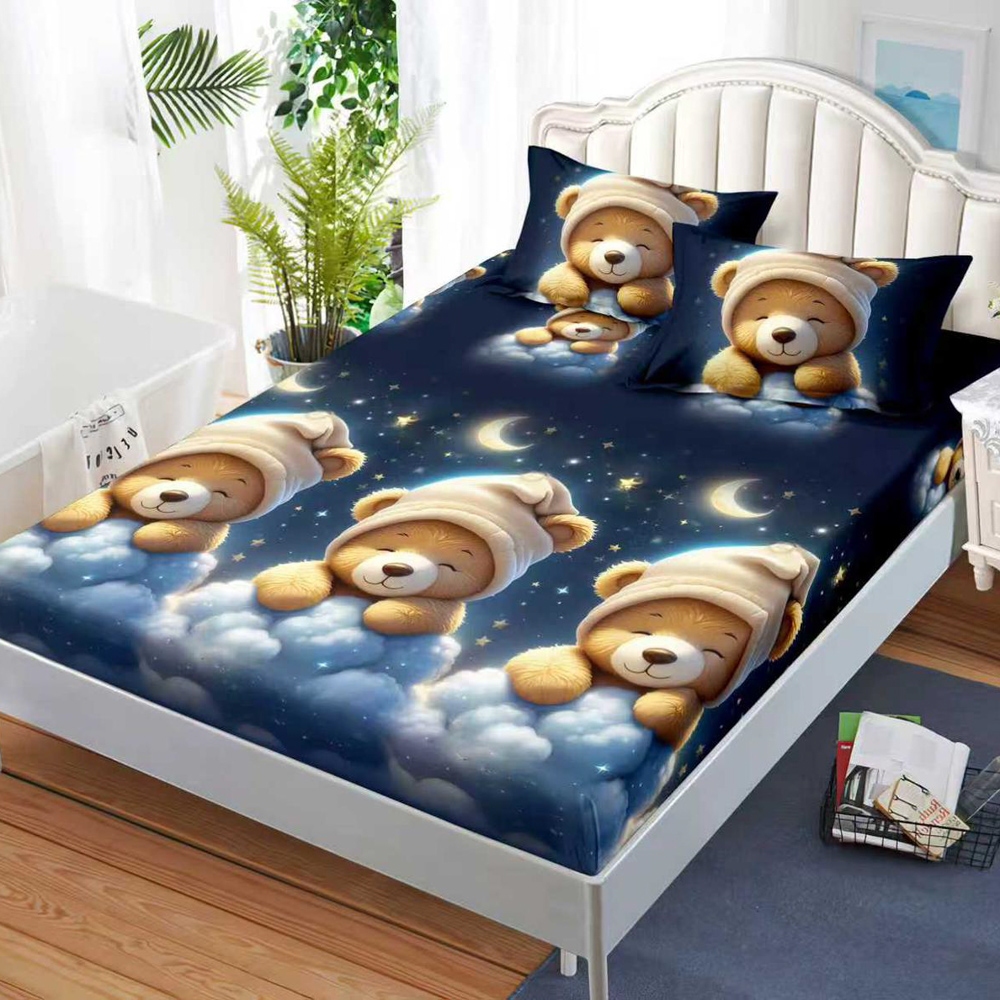 Cearsaf cu Elastic, Bumbac Satinat, 160x200 cm + 2 Fete de Perna 50x70 cm, Albastru, ursuleti