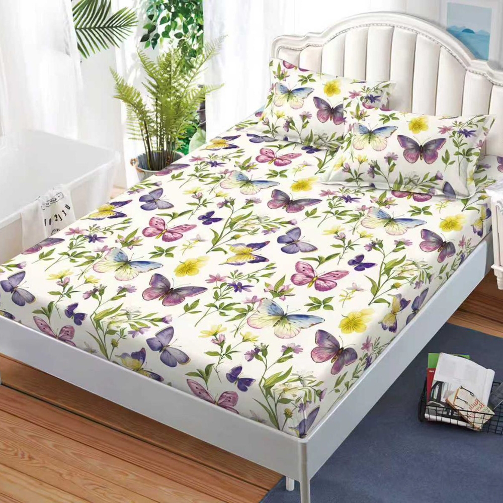 Cearsaf cu Elastic, Bumbac Satinat, 160x200 cm + 2 Fete de Perna 50x70 cm, Crem, fluturi colorati