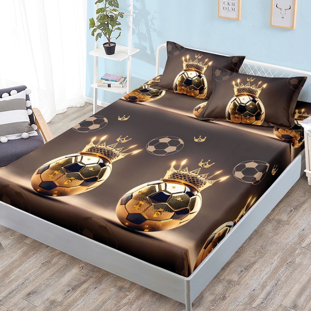 Cearsaf cu Elastic, Bumbac Satinat, 160x200 cm + 2 Fete de Perna 50x70 cm, Maro, minge de fotbal