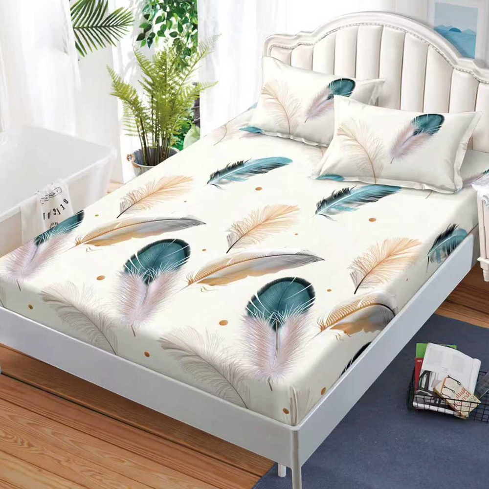 Cearsaf cu Elastic, Bumbac Satinat, 160x200 cm + 2 Fete de Perna 50x70 cm, Crem, pene colorate