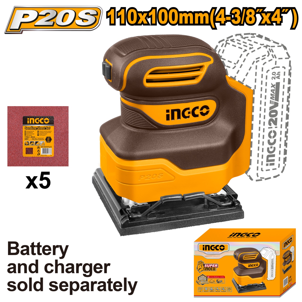Slefuitor masina de slefuit cu vibratii 20V, 110x100mm, fara acumulator INGCO CSHSLI2014
