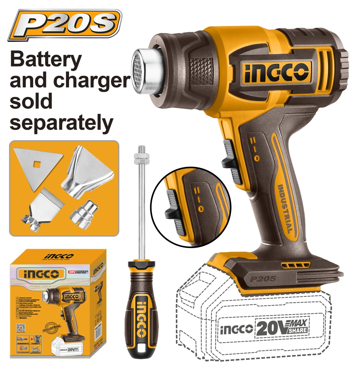 Pistol cu aer cald 20V, 300/550°C, 100/200 L/min, cu 4 accesorii – fara acumulator HGLI2006