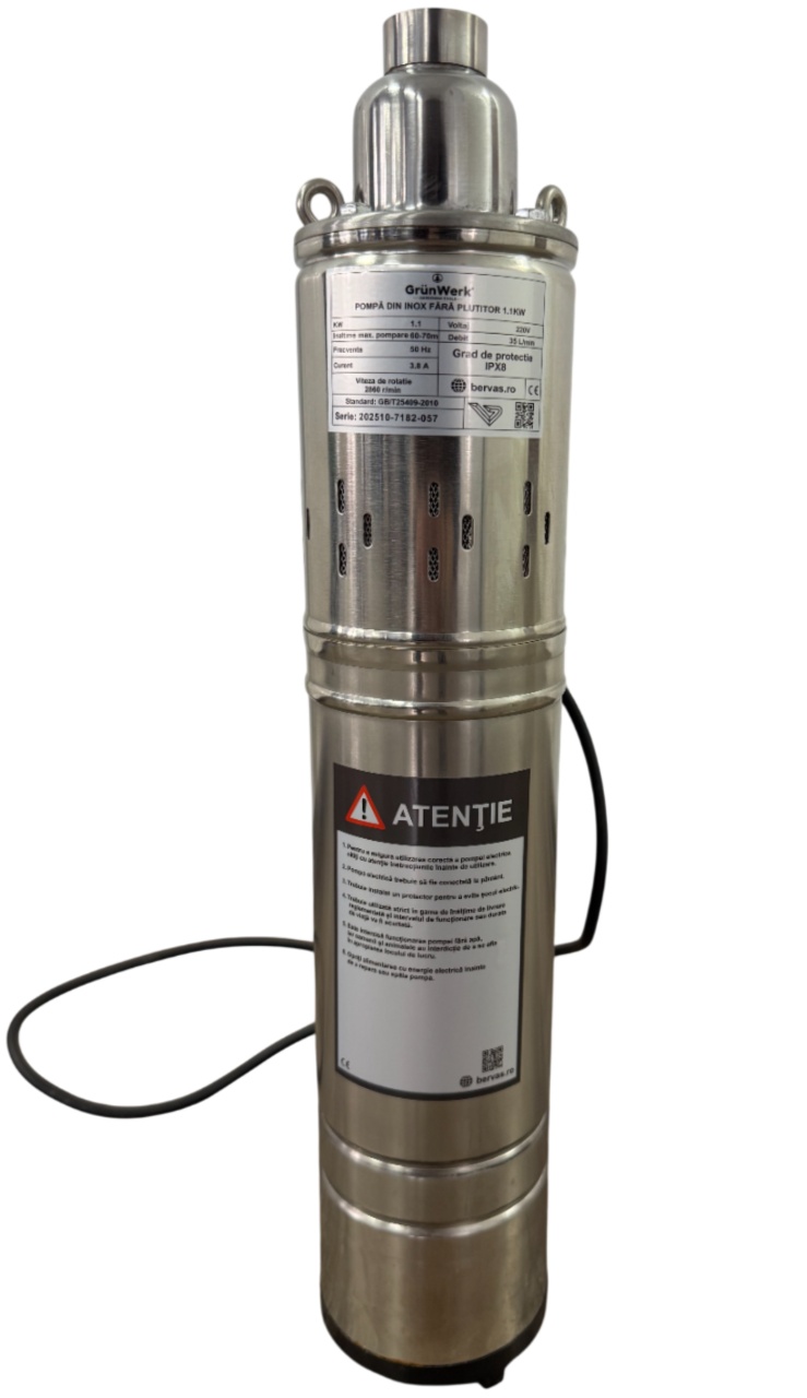 Pompa Inox cu Snec Submersibila cu Plutitor Automat GW GW7183, Putere 1.1KW (1100W), Cablu 9.5m, Inaltime 52cm, Latime 10cm, Circumferinta 31cm,