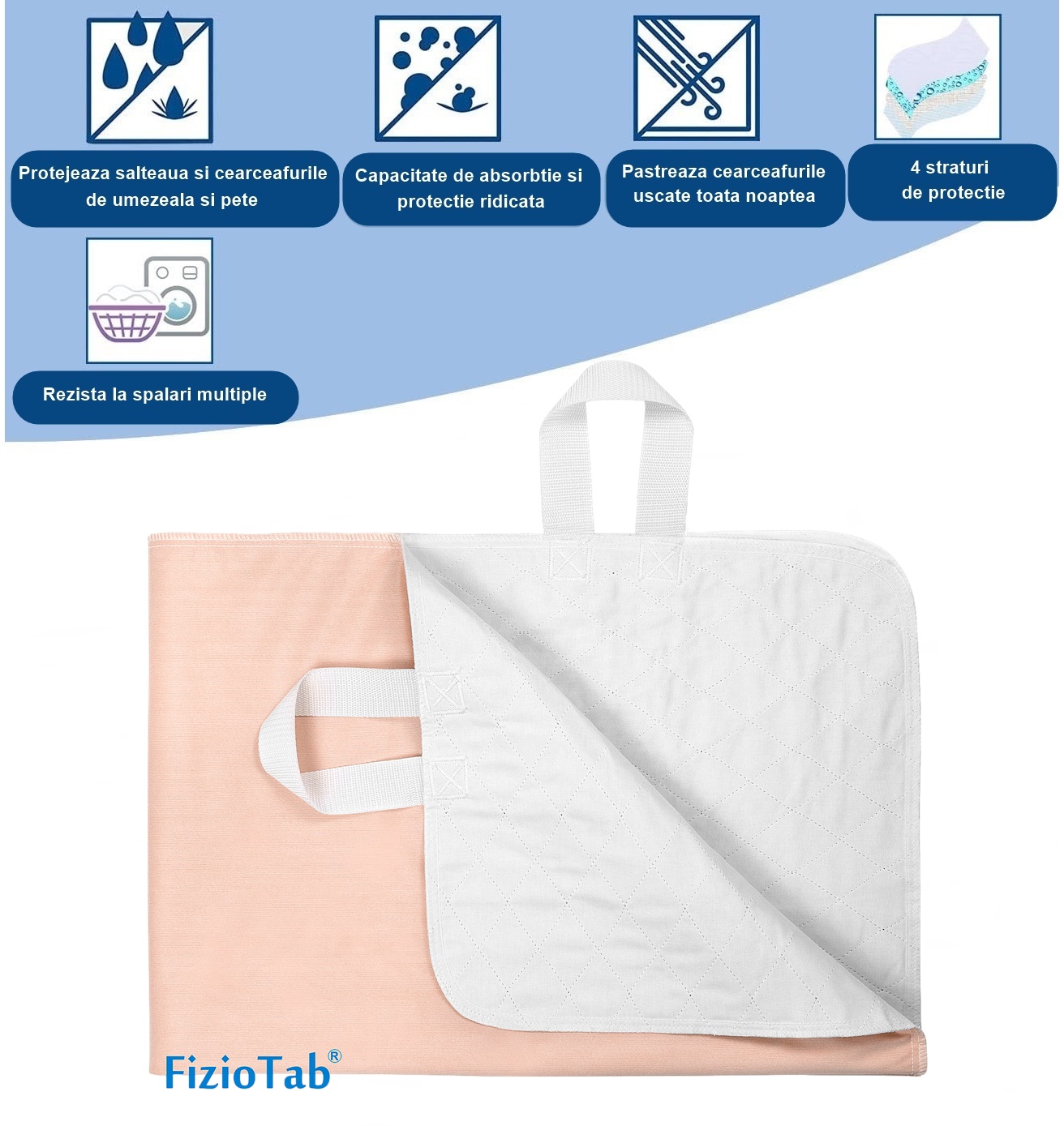 Aleza Impermeabila cu manere, Lavabila si Reutilizabila FizioTab® Ideala pentru pacienti cu icontinenta urinara si pentru copii Dimensiune aleza 130 x 90 cm, Bej/Alb Aleza/Protectia pentru saltea impermeabila si reutilizabila este recomandata celor cu afectiuni de incontinenta, fiind un produs profesional, special conceput sub brandul FizioTab®. Protectie saltea cu capacitate mare de absorbtie datorita barierei speciale din poliester si vascoza din stratul intern. Absorbant si delicat fata de piele, datorita bumbacului 100% respirabil de pe partea superioara. Caracteristicile produsului: Capacitate mare de absorbtie a fluidului; Rezista la peste 300 de spalari! Impermeabila atat la apa, cat si la sange si urina Refolosibila Lavabila, dupa fiecare utilizare se spala la max 95 grade La o singura utilizare poate retine pana la 2 litri de lichid Fata: 50% Bumbac, 50% Poliester Umplutura: 95% polyester, 5% vascoza Spate: PVC cu Poliester Culoare: Bej / Alb Dimensiune: 130 X 90 cm Absorbant si Impermeabil Protectia pentru saltea impermeabila este recomandata celor cu afectiuni de incontinenta, fiind un produs profesional, special conceput sub brandul FizioTab®. Aleza FizioTab® se foloseste cu succes si pentru catei!