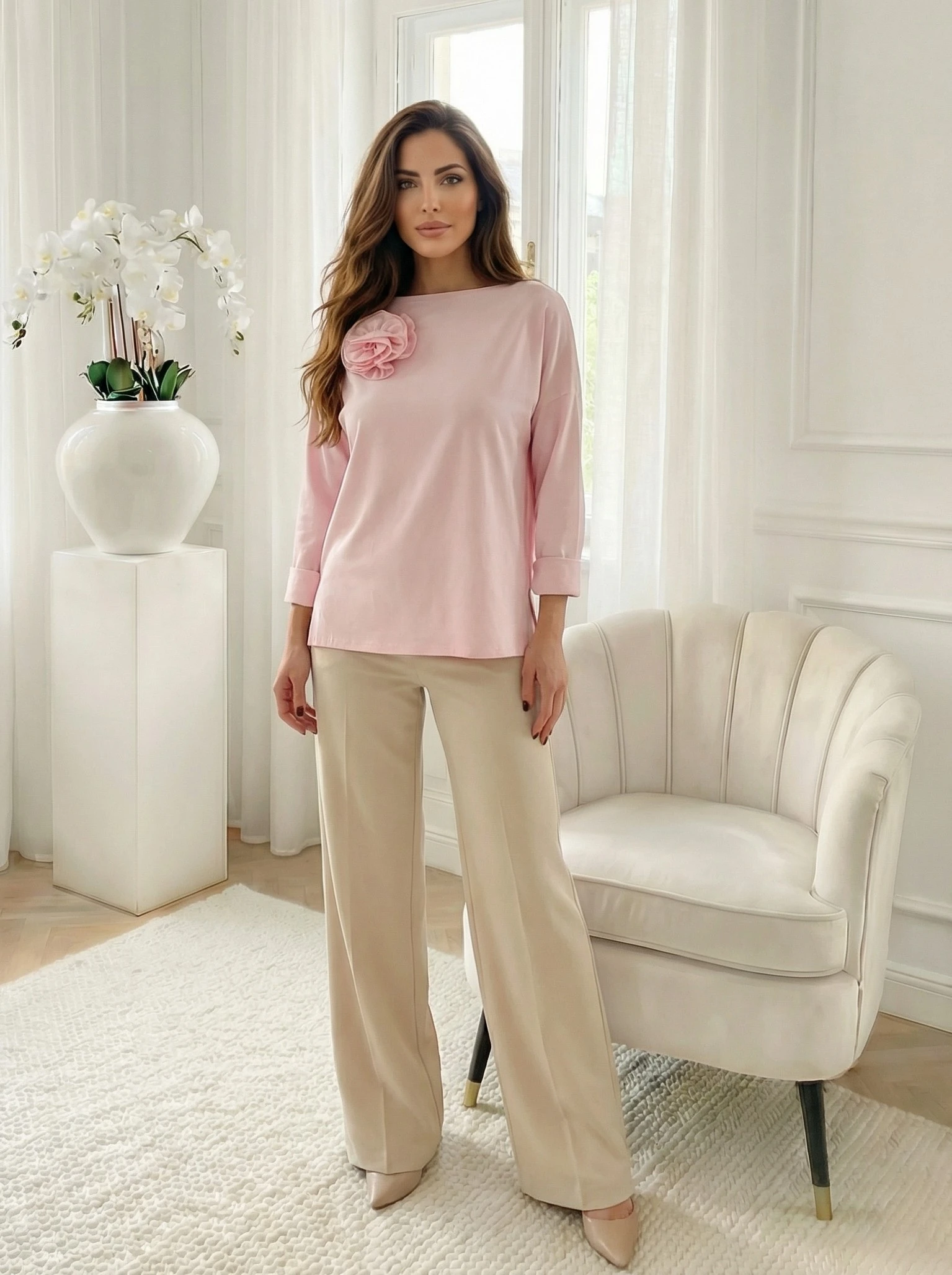 Bluza lejera roz cu aplicatie florala 3D, o piesa vestimentara remarcabila prin eleganta sa minimalista si detaliile sofisticate, fiind creata pentru a aduce un plus de stil garderobei tale de zi cu zi. Realizata dintr-un material fin si elastic, aceasta