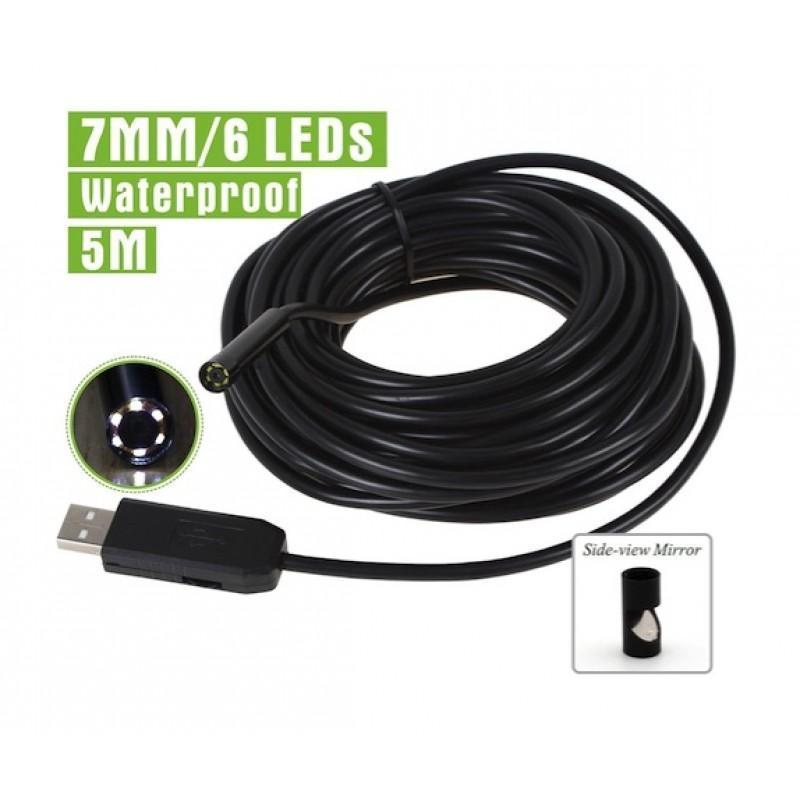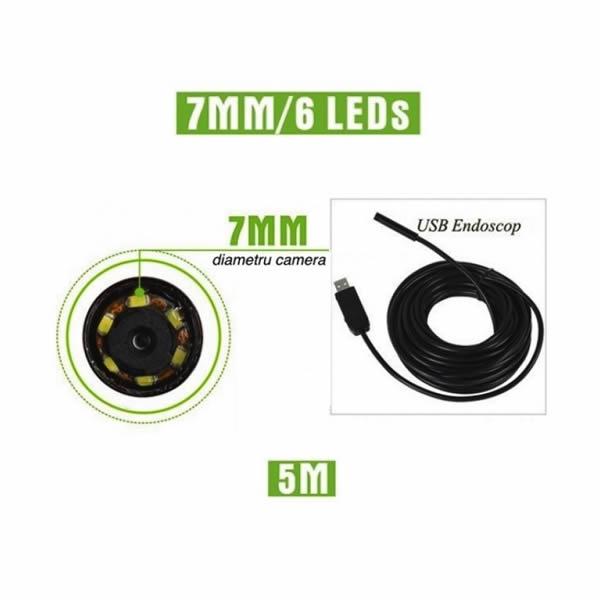 Camera endoscop foto-video Diametru 7 mm, cablu de 5 metri, Waterproof se poate folosi la investigarea starii locurilor stramte si inguste poate fi folosita cu succes si ca o camera foto/ video spion este protejat la patrunderea apei si prafului, ceea ce mareste aria de aplicabilitate sistemul de iluminare circular cu lumina alba neutra asigurata de leduri faciliteaza inspectarea locurilor neiluminate sau cu lumina slaba interfata USB asigura transmiterea imaginilor catre un laptop, acestea putand fi inregistrate. Utilizari recomandate: la studierea tevilor, conductelor, canalelor la inspectarea motoarelor auto (de ex. interiorul cilindrilor) in stomatologie, pentru vizualizarea cavitatii bucale la investigarea medicala a corpului uman: piele, urechi, nas si alte parti ale corpului folosirea de catre dentisti pentru vizualizarea cavitatii bucale in electronica, la studierea circuitelor imprimate sau a circuitelor si pieselor miniatura in cristalografie si mineralogie, la studierea cristalelor si a rocilor in mecanica, la studiul suprafetelor (rugozitate, aspect, taieturi, cavitatii, etc.) in industria textila, la studiul materialelor textile Caracteristici si avantaje: camera are 7 mm diametru, 1.9 VGA COSM dotata cu 6 LED, lumina ajustabila cablu-endoscop lung de 5 Metri cu o interfata USB, puteti conecta acest endoscop la computer rezistenta la apa IP67 este pentru a extinde viziunea ta in zone dificile (evaluarea IP67 garanteaza un rating de impermeabilitate, indiferent cat de umed sau murdar este domeniul de activitate, acesta va continua sa functioneze) acest endoscop poate ajunge si inspecta aproape oriunde, deoarece are un cablu lung. rezolutie video: 640x480 FPS: 30CPS luminozitate reglabila USB 2.0 sursa de alimentare temperatura: pana la 80 grade C culori: 24 bits unghi vizualizare: 67 grade cap atasabil vedere tip oglinda
