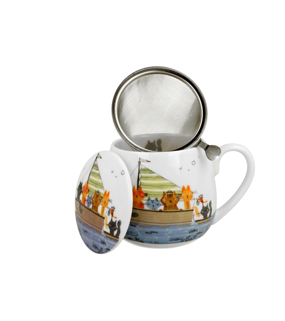 MARYNARZE (Pisici marinari) este o cană cu infuzor, gândită pentru cei care beau ceai vrac și vor o soluție simplă, fără accesorii separate. Ilustrația cu pisicuțe pe barcă e veselă și ușor de iubit, iar setul complet (cană + infuzor + capac) o face perfectă și pentru cadou. Ce primești• 1 x cană din porțelan, 430 ml, model Cat’s World – MARYNARZE• 1 x infuzor metalic tip sită (fin)• 1 x capac din porțelan (ajută la infuzare și poate deveni suport pentru infuzor)• 1 x cutie cadou asortată Beneficii• Set complet pentru ceai vrac: bei direct din cană, fără filtru de hârtie• Infuzor fin: reține frunzele mai mici și îți lasă lichidul curat• Capacul păstrează căldura și aroma în timpul infuzării; după, îl folosești ca suport pentru infuzor• Capacitate generoasă (430 ml) – potrivită pentru o infuzie „serioas㔕 Ilustrație veselă – cadou sigur pentru iubitorii de pisici Cum o foloseștiPui ceaiul în infuzor, torni apă la temperatura potrivită, acoperi cu capac și lași la infuzat. Scoți infuzorul și îl așezi pe capac (folosit ca farfurioară). Clătești infuzorul imediat după utilizare pentru o curățare ușoară. ÎngrijireCana și capacul: spală cu burete moale. Infuzorul: clătește după fiecare folosire și, ocazional, spală-l mai bine dacă rămân uleiuri/arome. Detaliu de stilScena cu „pisici marinari” și valuri albastre dă un vibe relaxat, de vacanță, potrivit pentru pauze scurte la birou sau acasă.