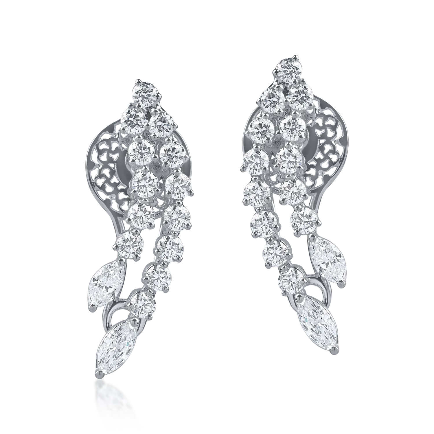 Cerceii din aur alb cu diamante microsetting de 2ct surprind prin combinatia rafinata dintre linii alungite si straluciri delicate. Taietura marquise, cu forma sa eleganta, amplifica senzatia de alungire si luminozitate, iar diamantele round adauga o textura fina si un plus de echilibru vizual. Aurul alb accentueaza claritatea si intensitatea fiecarei pietre, oferind un finisaj modern. Perfecti pentru femeia care apreciaza detaliile sofisticate, acesti cercei TEILOR transforma orice tinuta intr-o declaratie de stil si feminitate contemporana.