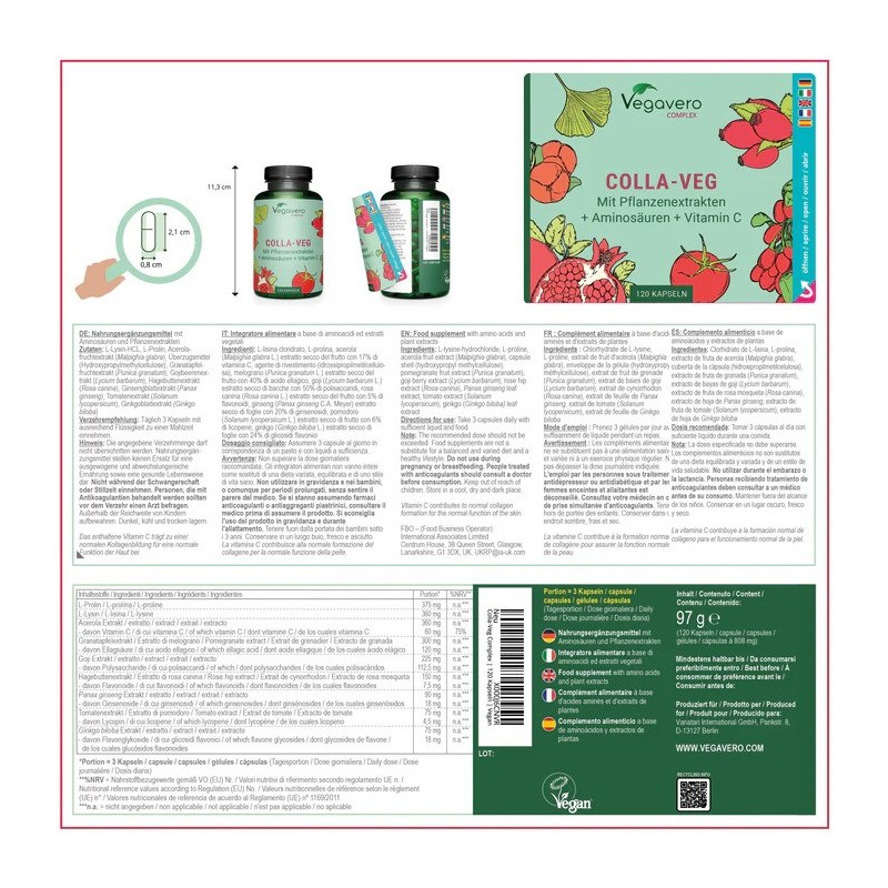 Beneficii Collagen Complex Vegan - ajuta la intarirea sintezei fibrelor de colagen - faciliteaza intarirea oaselor si articulatiilor - ajuta la mentinerea fermitatii si tonului pielii - poate inhiba formarea ridurilor si a celulitei - faciliteaza mentinerea elesticitatii pielii - se asimileaza rapid - are o compozitie simpla Colagenul este cea mai abundenta proteina din corpul uman. Corpul nostru formeaza fibre din colagen, care formeaza o schela de colagen si astfel stabilizeaza oasele, dintii si, mai presus de toate, tesutul conjunctiv al pielii. Din pacate, formarea colagenului in organism scade odata cu varsta. Complexul nostru Collagen Plus contine, printre altele, vitamina C, care contribuie la formarea normala a colagenului pentru functia normala a pielii. Colagenul este un material important pentru tesuturi, responsabil pentru flexibilitatea si rezistenta lor. Face pielea bine tonifiata, in timp ce parul si unghiile - puternice. Pe masura ce trec anii, nivelul natural de colagen scade si corpul incepe sa imbatraneasca. Suprafata pielii este umpluta cu primele riduri si celulita care nu arata foarte frumos. Cel mai bun mod de a elimina problema lipsei de colagen este completarea acestuia. Pentru complexul nostru Collagen Plus am considerat, testat, respins si re-dezvoltat pentru o lunga perioada de timp. Pentru ca am vrut un produs care are efectele produselor obisnuite de colagen, dar spre deosebire de acestea nu este derivat din substante animale. Termeni cum ar fi colagenul marin sau salata de colagen hidrolizat nu sunt altceva decat colagenul de la piepteni, cartilajul de carne de vita sau aripioarele de peste. Si asa ceva nu intra in flacoanele noastre! Rezultatul este complexul nostru Collagen Plus: o combinatie unica de 7 extracte de plante diferite si cei doi aminoacizi L-prolina si L-lizina. Acerola si rodie: Acerola, numita si cherry acerola, si rodie sunt cunoscute pentru continutul ridicat de vitamina C. Printre altele, aceasta vitamina contribuie la formarea normala a colagenului pentru functionarea normala a pielii noastre. Deoarece organismul nostru nu poate produce vitamina C in sine, trebuie sa-l ingeram oral. Doza zilnica recomandata a produsului nostru acopera deja mai mult de 75% din necesarul mediu de vitamina C. In plus, semintele de rodie sunt bogate in acid ellagic si diverse vitamine B, care s-au dovedit stiintific ca protejeaza celulele noastre de stresul oxidativ. Macese si rosii: macesii si rosiile sunt, de asemenea, printre fructele bogate in vitamina C. Ele sunt, de asemenea, caracterizate prin continutul ridicat de flavonoide sau carotenoide (licopen). Gojii - fructe de padure: Goji fructe de padure rosii contin o proportie mare de asa-numitele polizaharide bioactive, complexe multiple de zaharuri care sunt legate de proteine. In plante actioneaza ca substante importante de aparare. Ginseng & Ginkgo: In medicina traditionala chineza, ginsengul si ginkgo-ul sunt cunoscute de mult ca plante medicinale. Ambele plante sunt bogate in substante vegetale secundare si uleiuri esentiale. Aminoacizi: L-lizina si L-prolina sunt aminoacizii care sunt necesari ca blocuri de baza ale proteinelor, in special in formarea colagenului. EFICACITATE - Colagenul marin sub forma de peptide de colagen de peste trece prin cuticula si ajunge direct la derm. Merge adanc in structura sa, asigurand intarirea naturala. ASIMILARE RAPIDA - dupa inghitire, colagenul sub forma de pulbere de colagen hidrolizat merge direct la stomac, unde este eliberat instantaneu. Astfel, impactul sau este mult mai rapid in comparatie cu filele de colagen. FORMA COMODA - colagenul sub forma de pudra este destinat celor care au dificultati la inghitirea pastilelor. Pentru a-l consuma, trebuie sa dizolvati colagenul in apa sau sucul preferat. Ce nutrienti favorizeaza productia de colagen? Unitatile de procolagen care stau la baza a ceea ce se transforma apoi in colagen, sunt produse de organism prin combinarea doi aminoacizi - glicina si prolina si cu aportul vitaminei C (Molecula de tropocolagen este formata din trei unitati de procolagen -albastru, verde, rosu). Asadar, organismul uman are o capacitate mai ridicata de productie a acestei proteine in cazul in care dispune de depozite de substante nutritive precum: Vitamina C – din surse naturale precum citrice, ardei gras, broccoli si capsuni; Proline – din surse naturale precum albusul de ou, germeni de grau, produse lactate, varza, sparanghel, ciuperci, carne, branza, soia; Glicina - pielea de porc, piele de pui, gelatina, alte alimente care contin proteine; Cupru - carne din organe, nuci, seminte de susan, pudra de cacao, caju, linte Antocianidine – din surse naturale precum mure, afine, cirese, zmeura; Vitamina A – din surse naturale precum alimente de origine animala, alimente de origine vegetala care contin beta-caroten; Proteine de calitate ridicata – din surse naturale precum carne, pasari de curte, fructe de mare, lactate, leguminoase, tofu. Regenerarea asistata a tesuturilor Membranele pe baza de colagen pot fi utilizate in terapia parodontala si in implantologie. Barierele de colagen pot minimiza migrarea spre dinti a celulelor cu crestere rapida din jurul gingiei, mentinand un spatiu liber in care celulele dentare se pot regenera. Proteze vasculare Grefele de tesut de colagen de la donatori sunt folosite in procesul de regenerare a nervilor periferici, in protezele vasculare si in reconstructia arteriala. Ameliorarea osteoartritei Suplimentele de colagen pot contribui la imbunatatirea functiei articulare la persoanele care sufera de osteoartrita. Prospect Collagen Plus Complex Mod de administrare: Luati 3 capsule zilnic cu suficient lichid si alimente. ingrediente: L-prolina, extract de fructe acerola (Malpighia glabra) cu 17% vitamina C, capsula (hidroxipropil metilceluloza), extract de fructe de rodie (Punica granatum) cu acid elagic 40%, extract de goji (Lycium chinense) cu 50% polizaharide, extract de trandafir (Rosa canina)