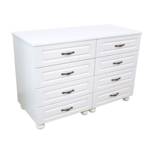 Comoda Dynasty cu 8 sertare este extrem de spatioasa si eleganta. Carcasa comodei este fabricata din PAL melaminat Alb cu grosimea de 16 mm, iar fetele sertarelor sunt fabricate din MDF Alb cu grosimea de 18 mm. Fetele sertarelor sunt frezate pentru un aspect elegant, iar blatul comodei fabricat din MDF Alb cu grosimea de 25 mm desavarseste acest aspect elegant, dar asigura si o rezistenta sporita la depozitarea unor obiecte grele pe comoda. Picioarele clasice sunt fabricate din lemn si sunt vopsite, iar manerele metalice antichizate contribuie si ele la aspectul deosebit al comodei. Cele 8 sertare au glisiere cu bile si amortizare pentru o inchidere silentioasa, iar impreuna cu fundurile din PAL melaminat cu grosimea de 16 mm asigura o rezistenta sporita pentru folosirea zilnica a sertarelor. Lungimea comodei este de 1350 mm fara blatul din MDF si 1380 mm cu tot cu blatul din MDF. Inaltimea totala este de 905 mm, iar adancimea este de 580 mm. CARACTERISTICI GENERALE Tip produs: Comoda Utilizat pentru: Dormitor Stil: Clasic Numar sertare: 8 Finisaj: Laminat Culoare: Alb DETALII MATERIAL Tip fronturi: MDF Material blat: MDF Material carcasa: PAL Material feronerie: Metal DIMENSIUNI Lungime: 138 cm Adancime: 58 cm Inaltime: 90 cm Grosime blat: 25 mm *Nota: Schita de montaj nu se afla in interiorul coletului intre piesele de mobila. Schita de montaj o sa fie atasata pe spatele facturii.