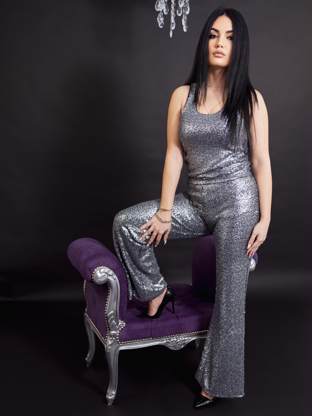 Set din doua piese cu paiete, maieu si pantalon. Pantalonul este croit lejer, are talie inalta si este evazat. Un set foarte versatil pentru orice ocazie, ideal atat cu sandale elegante, pantofi stiletto sau chiar si incaltari joase tip papuci, balerini, sandalute. Printr-o croiala lejera, realizata dupa un tipar de succes, se potriveste pentru orice tip de silueta. Simplu, dar in acelasi timp emanand senzualitate si rafinament, este perfect pentru evenimente de zi sau la o iesire in