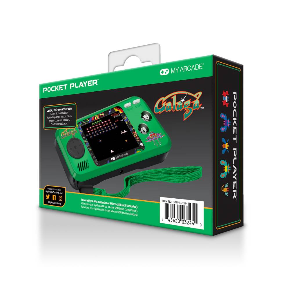 Pocket Player-ul de la My Arcade include versiunile complet jucabile ale clasicelor GALAGA™, GALAXIAN™ și XEVIOUS™. Cu un ecran color retroiluminat de 2.75, aceasta consola este optimizata pentru confort ergonomic si portabilitate compacta, oferind ore intregi de joc placut./nCaracteristici Cheie:/n/nEcran 2.75 Color Retroiluminat: Bucura-te de grafica vibranta si imagini clare pe acest ecran de inalta calitate./nOptiuni Versatile de Alimentare: Functioneaza cu 4 baterii AAA (neincluse) sau orice cablu Micro-USB (neinclus), oferind flexibilitate in alimentarea dispozitivului./nDifuzor Incorporat, Control de Volum si Jack pentru Casti de 3.5mm: Experimenteaza sunet clar si optiunea de a juca in privat cu casti./nDesign Ergonomic pentru Joc Confortabil: Conceput pentru a oferi o experienta confortabila in timpul sesiunilor lungi de joc./nDimensiuni Compacte cu Lant Inclus: Perfect pentru gaming pe drum, acasa sau in calatorii./n/nJocuri Incluse:/n/nGALAGA: Comanda nava spatiala si elimina extraterestrii inamici in acest shooter clasic./nGALAXIAN: Apara-te impotriva invaziei Flotei GALAXIAN in acest shooter arcade emblematic./nXEVIOUS: Navigheaza printre obstacole, trage in inamici si tinte aeriene in acest joc arcade provocator./n/nBeneficii pentru Utilizator:/n/nExperienta Autentica de Arcade: Redescopera emotia si provocarea jocurilor arcade clasice, potrivite pentru toate varstele./nPortabilitate: Designul compact si lantul inclus fac din acest dispozitiv alegerea ideala pentru gamingul pe drum sau acasa./nCadou Ideal: Perfect pentru colectionari si pasionati de jocuri video, oferind ore intregi de distractie captivanta./n