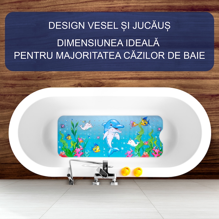 Covoras pentru cada, antialunecare Produs FizioTab®, 100x40 cm, Multicolor, Delfin Pentru produsele concepute sub brandul FizioTab®, intotdeauna siguranta este cea care primeaza! Daca sunteti in cautarea celui mai sigur si potrivit covoras de cada, cautarea a luat sfarsit! Covorasul FizioTab® este alegerea perfecta pentru baia ta! De ce sa alegi Covorasul de Baie FizioTab®? Dimensiune mare: 100 x 40 cm; Design multicolor, vesel si jucaus cu delfin si pestisori; 176 de orificii pentru drenarea apei si uscare rapida; Fabricat din pvc durabil si rezistent; Dimensiune: 100 X 40 cm; Grosime 1 cm; Non-Toxic; Nu contine BPA, ftalati sau latex; Fixare rapida si usoara Asezati covorasul in cada umpluta cu putina apa si apoi apasati ventuzele pentru a le fixa! Intotdeauna pasiti pe mijlocul covorasului cand intrati in cada! Intretinere usoara Clatiti dupa fiecare utilizare, pentru indepartarea oricaror depuneri uleioase si uscati; Lasati covorasul la aerisit inainte de reutilizarea acestuia, de preferat cu 24 de ore inainte; Partea superioara a Covorasului Model texturat, antialunecare, perfect pentru masajul talpilor in timpul dusului; Partea inferioara 200 de ventuze, care se fixeaza strans pe suprafete netede si curate!