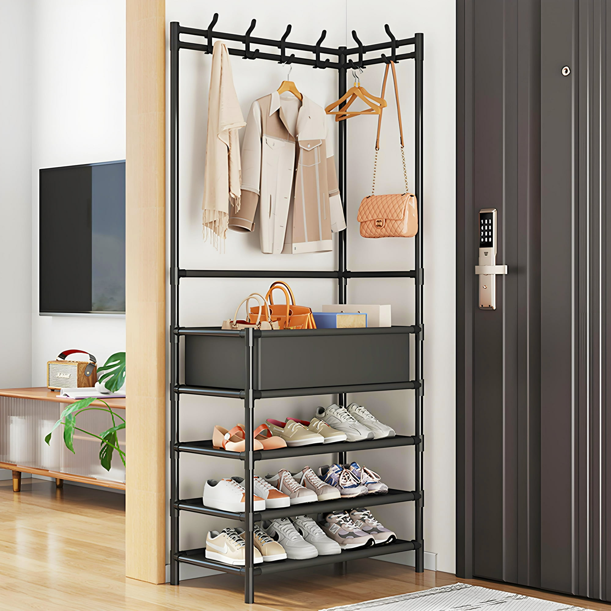 Cuier metalic cu rafturi (raft de organizare) Dimensiune 60 x 28 x 154 cm, Negru Organizeaza rapid holul, dormitorul sau biroul cu acest cuier metalic cu rafturi, cu design modern si format in picioare. Ofera spatiu generos pentru agatarea hainelor si accesoriilor, plus rafturi utile pentru depozitare, astfel incat sa pastrezi zona curata si ordonata chiar si in incaperi mici. Cuierul este usor de deschis si instalat, fiind o solutie practica pentru depozitare zilnica: poti atarna haine, genti, paltoane, palarii, cravate si accesorii, iar pe rafturi poti aseza obiectele pe care vrei sa le ai la indemana. Dimensiune: 60 x 28 x 154 cm Culoare: Negru Rafturi: 4 niveluri pentru depozitare Utilizare: acasa sau la birou (hol, dormitor, dressing, zona de intrare) Cele 4 niveluri de rafturi sunt ideale pentru depozitarea usoara a pantofilor. Combinatia dintre spatiul de agatare si rafturile multifunctionale ajuta la organizarea eficienta a obiectelor de zi cu zi. Avantaj: ocupa putin spatiu, se integreaza usor in decoruri moderne si ofera o organizare clara, pe verticala. Montaj: rapid si usor de instalat.