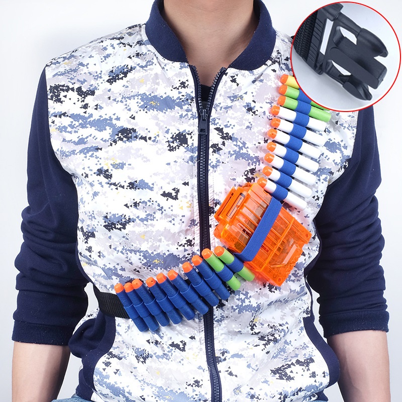 Cureaua de umar pentru sageti de magazie (Cartusele si incarcatorul nu sunt incluse) Nu lasati sa va surprinda lipsa de munitie de pe campul de lupta ! Cureaua tactica este gadgetul perfect pentru orice fan al lansatorului. Curea realizata cu grija, cu lungime reglabila. Cureaua are loc pentru sageti si un incarcator suplimentar. (Sagetile si incarcatorul nu sunt incluse). Aceasta jucarie va fi pe placul oricarui jucator. Pastrati o rezerva de cartuse la dumneavoastra in permanenta! Cu