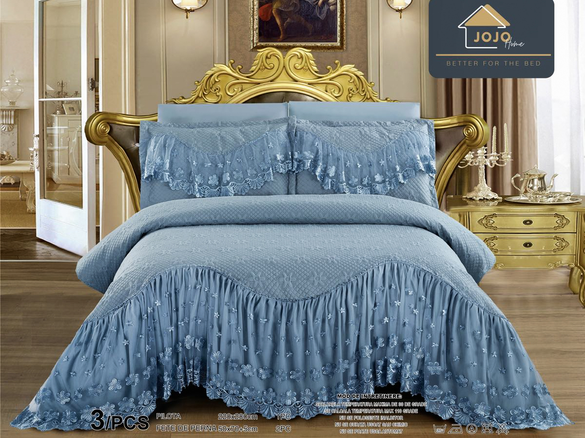 Cuvertura de lux, pentru pat 2 persoane, din bumbac tip finet, cu volanase din voal cu dantela brodata, pentru un plus de eleganta si rafinament. Cuverturile de pat sunt cele mai potrivite pentru anotimpul rece. Totodata, ele adauga mai multa caldura dormitorului tau. Cuvertura este matlasata ultrasonic. Setul vine ambalat in husa transparenta din plastic - poate fi folosita ca husa pentru depozitare sau ca ambalaj pentru a darui celor dragi aceasta minunata cuvertura. Avantajele cuve