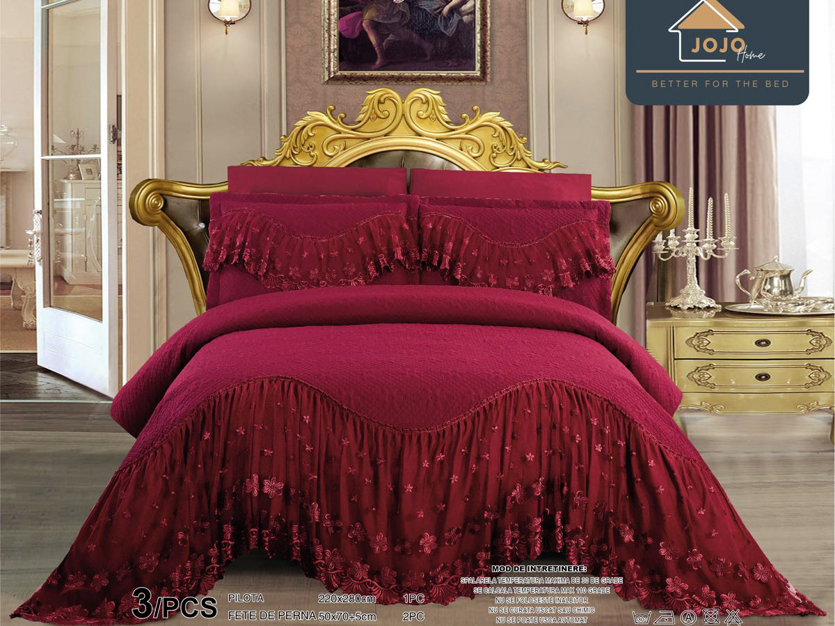 Cuvertura de lux, pentru pat 2 persoane, din bumbac tip finet, cu volanase din voal cu dantela brodata, pentru un plus de eleganta si rafinament. Cuverturile de pat sunt cele mai potrivite pentru anotimpul rece. Totodata, ele adauga mai multa caldura dormitorului tau. Cuvertura este matlasata ultrasonic. Setul vine ambalat in husa transparenta din plastic - poate fi folosita ca husa pentru depozitare sau ca ambalaj pentru a darui celor dragi aceasta minunata cuvertura. Avantajele cuve