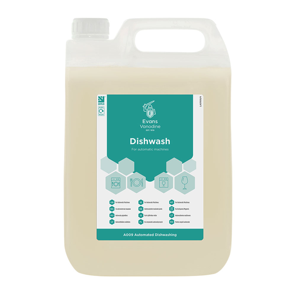 Detergent activ usor spumant pentru spalat vase Evans Dishwash in conditii de duritate scazuta spre medie a apei. Se foloseste in orice tip de masina de spalat vase. Eficient in prevenirea formarii pietrei si a depunerilor de resturi. Potrivit pentru toate tipurile de masini automate de spalat vase cu unul sau mai multe rezervoare. pH 11.9 Mod de ambalare: bidon 5 litri. Dilutie: 0.1%.