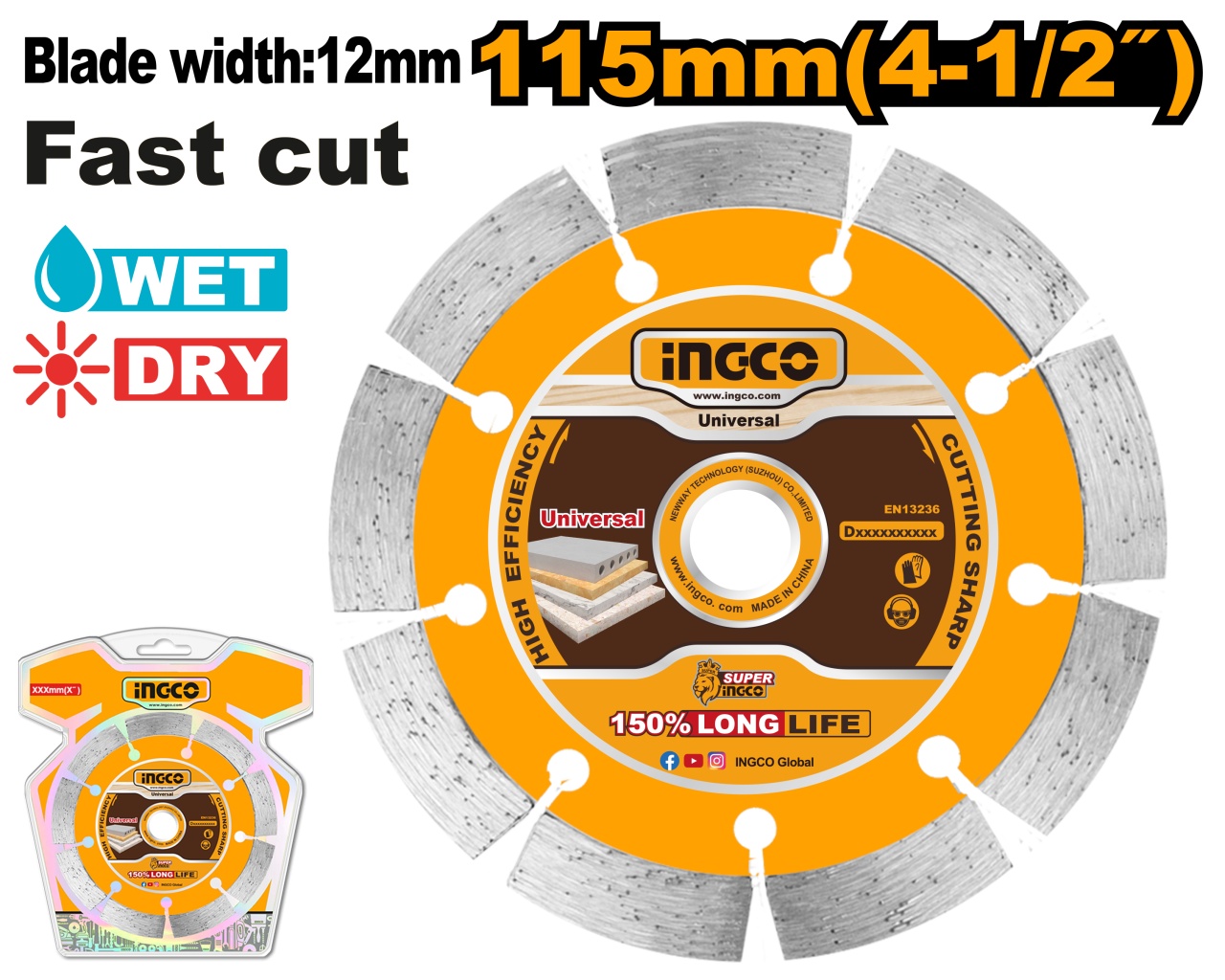 Disc Diamantat Segmentat 115x22.2mm 12mm INGCO DMD0111513, pentru beton, caramida, granit si marmura, taiere uscata si umeda