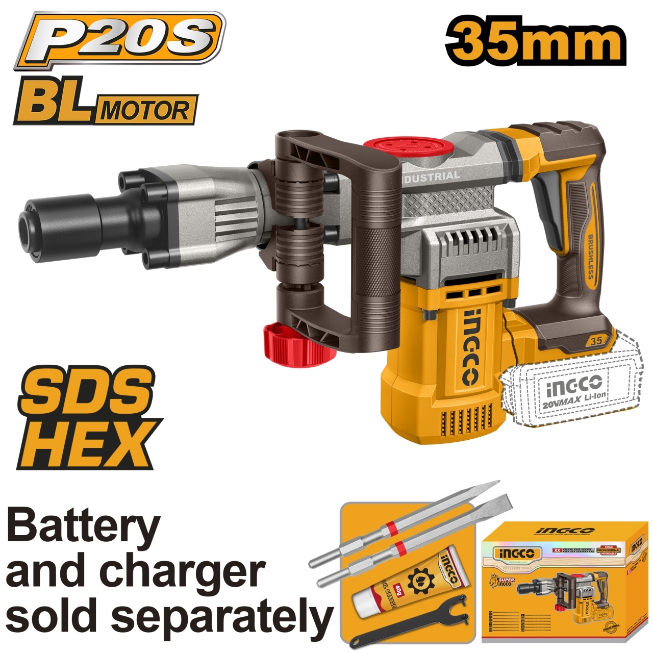 Demolator Profesional 20V SDS HEX Brushless INGCO CDBLI20358, 16J, 0-3200 bpm, sistem prindere SDS HEX, fara acumulator si incarcator