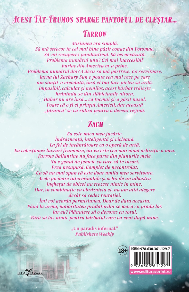 #html-body [data-pb-style=YD9VCC9]{justify-content:flex-start;display:flex;flex-direction:column;background-position:left top;background-size:cover;background-repeat:no-repeat;background-attachment:scroll}FARROW Misiunea era simplă. Să mă strecor în cel mai bine păzit conac din Potomac. Să-mi recuperez pandantivul. Să ies nevăzută. Problema numărul unu? Cel mai inaccesibil burlac din America m-a prins. Problema numărul doi? A decis să mă păstreze. Ca servitoare. Iarna lui Zachary Sun e poate cea mai rece pe care am simțit-o vreodată, însă el îmi face pielea să ardă. Impasibil, calculat și nemilos, acest bărbat trăiește hrănindu-se din slăbiciunile altora. Habar nu are însă... că tocmai și-a găsit nașul. Poate că o fi el prințul Americii, dar această „țărancă” se va ridica pentru a deveni regină. ZACH Ea este mica mea jucărie. Îndrăzneață, inteligentă și vicleană. La fel de încântătoare ca o operă de artă. Eu colecționez lucruri frumoase, iar ea este cea mai nouă achiziție a mea. Farrow Ballantine nu face parte din planurile mele. Nu e genul de femeie cu care să te însori. Prea nesupusă. Complet de necontrolat. Ca să nu mai spun că este doar umila mea servitoare. Acele picioare interminabile și ochii de un albastru înghețat de obicei nu trezesc nimic în mine. Dar, în combinație cu obrăznicia ei, nu am altă alegere decât să cedez tentației. Îmi voi acorda permisiunea. Doar de data aceasta. Până la urmă, majoritatea prădătorilor se joacă cu prada lor. Iar eu? Plănuiesc să o devorez cu totul. Fără să las nimic pentru bărbatul care va veni după mine. „Un paradis infernal.” Publishers Weekly „Repovestirea mea preferată a basmului despre Cenușăreasa. Fiecare pagină este o încântare!” Ava Harrison, autoare de bestsellere USA Today „Îmi doresc să îmi pot injecta această carte în măduva oaselor. Una dintre cele mai frumoase pe care le-am citit vreodată!” InkDrinker „Niciodată în viața mea n-am chicotit așa de mult. O poveste unică și intensă, plină de trăiri și pasiune.” Kat Fenton