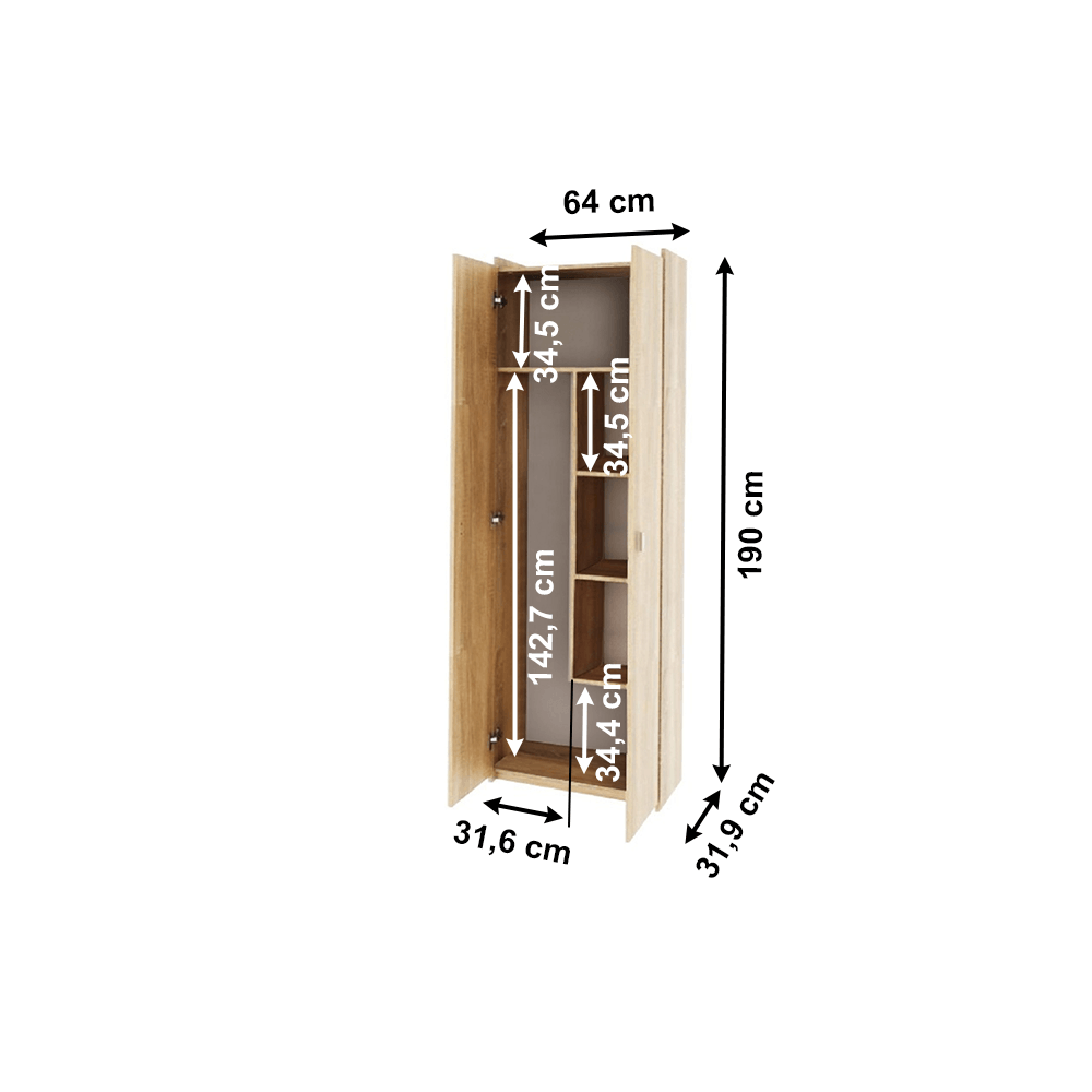 Dulap combinat. Dimensiuni (LxHxA): 64x190x32 cm.Inaltimea fiecarui raft: 34,5 cmInaltimea pana la raftul inferior: 34,4 cmInaltimea pana la raftul superior: 142,7 cmGrosimea materialului: 16 mmMaterial si culoare: PAL melaminat, stejar sonoma.