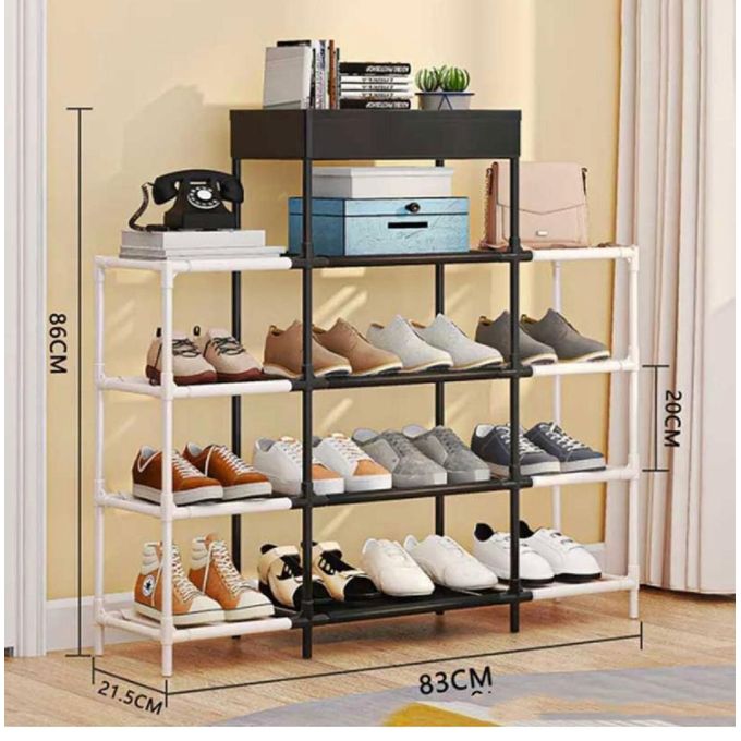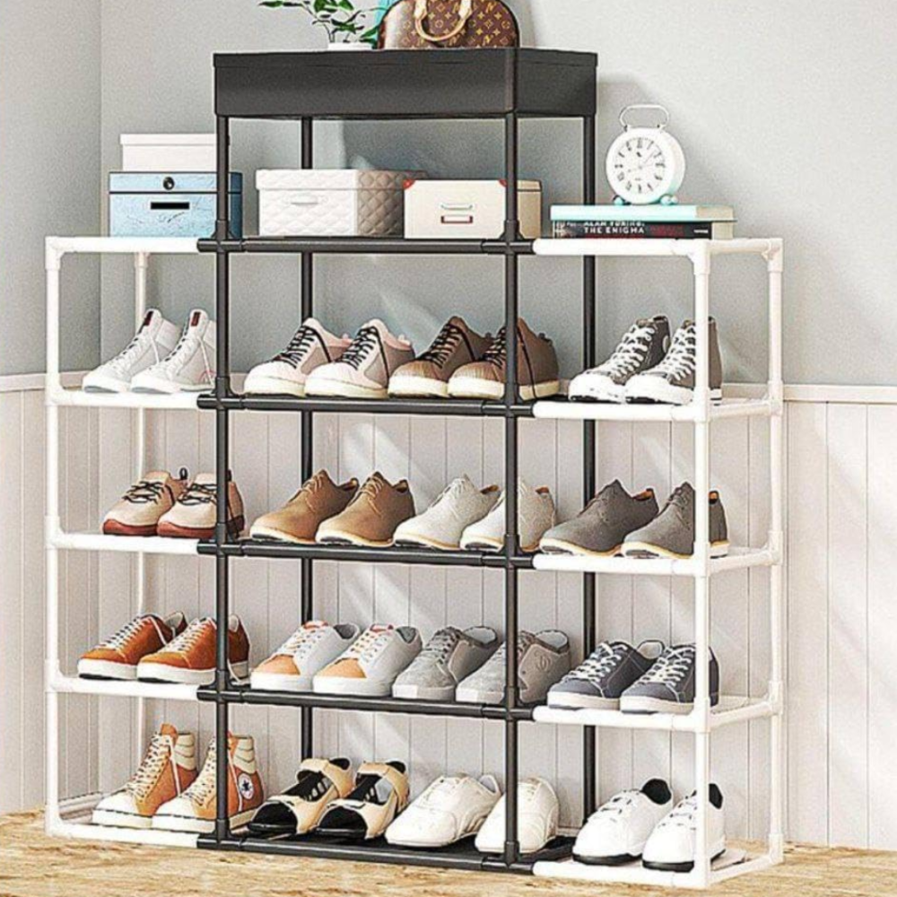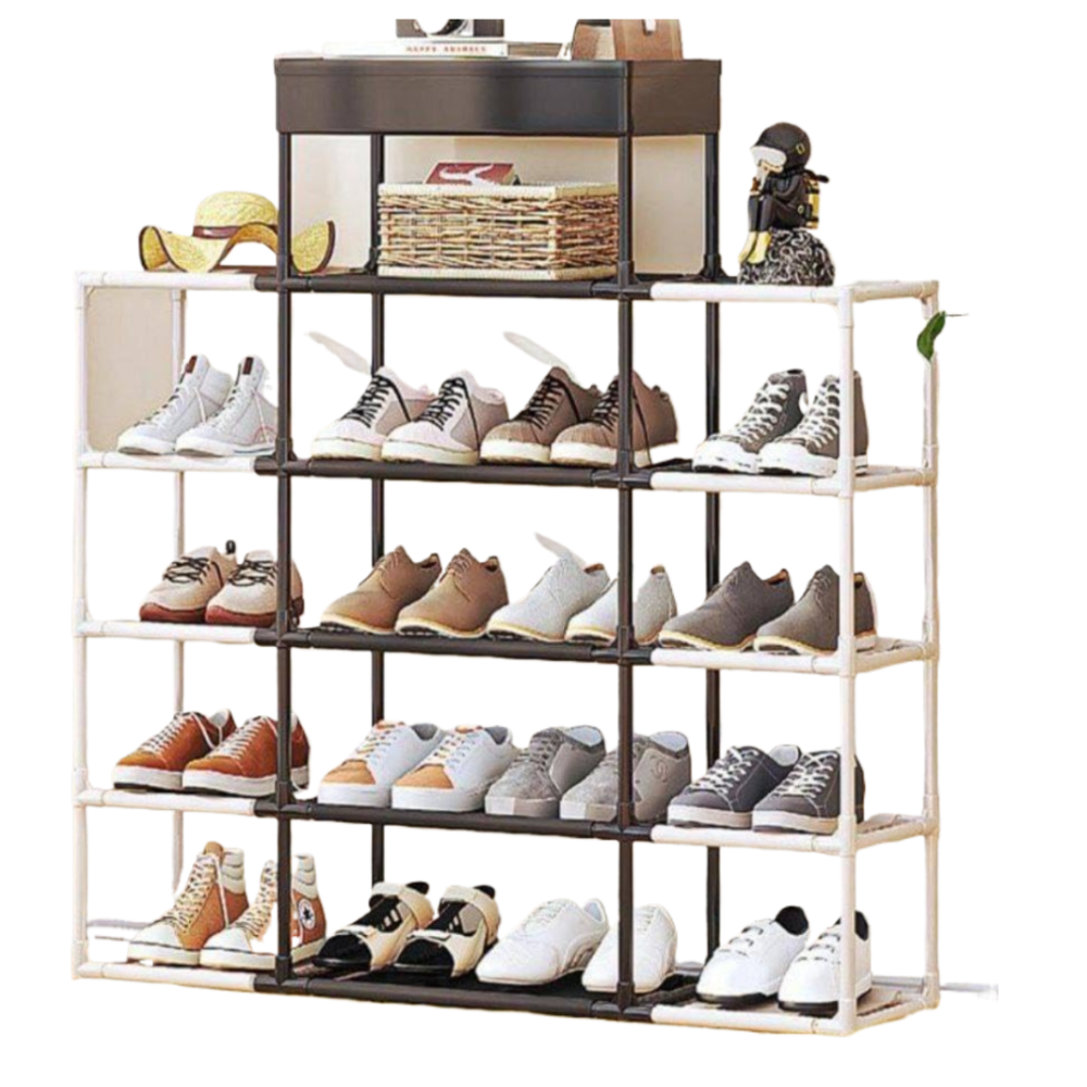 Etajera incaltaminte cu 5 niveluri Inaltime 86 cm H x Lungime 83 cm Adancime 21.5 cm x Inaltime raft 20 cm Material: metal, plastic, PP Greutate Maxima per raft - 5 kg Portabil si usor de instalat Conectori din PP durabil Nu necesita unelte pentru asamblare Cadru metalic tubular usor si totusi robust, ceea ce face raftul de incaltaminte durabil si usor de deplasat. Polite generoase care sunt fabricate dintr-un material textil ecologic, netesut si dispune de un spatiu amplu pentru a va pastra pantofii organizati. Suport pentru incaltaminte cu 4 rafturi, usor de asamblat si foarte practic. Inaltimea fiecarui raft este de 20 cm. Picioarele sunt prevazute cu capace pentru a proteja podeaua fara a provoca daune.