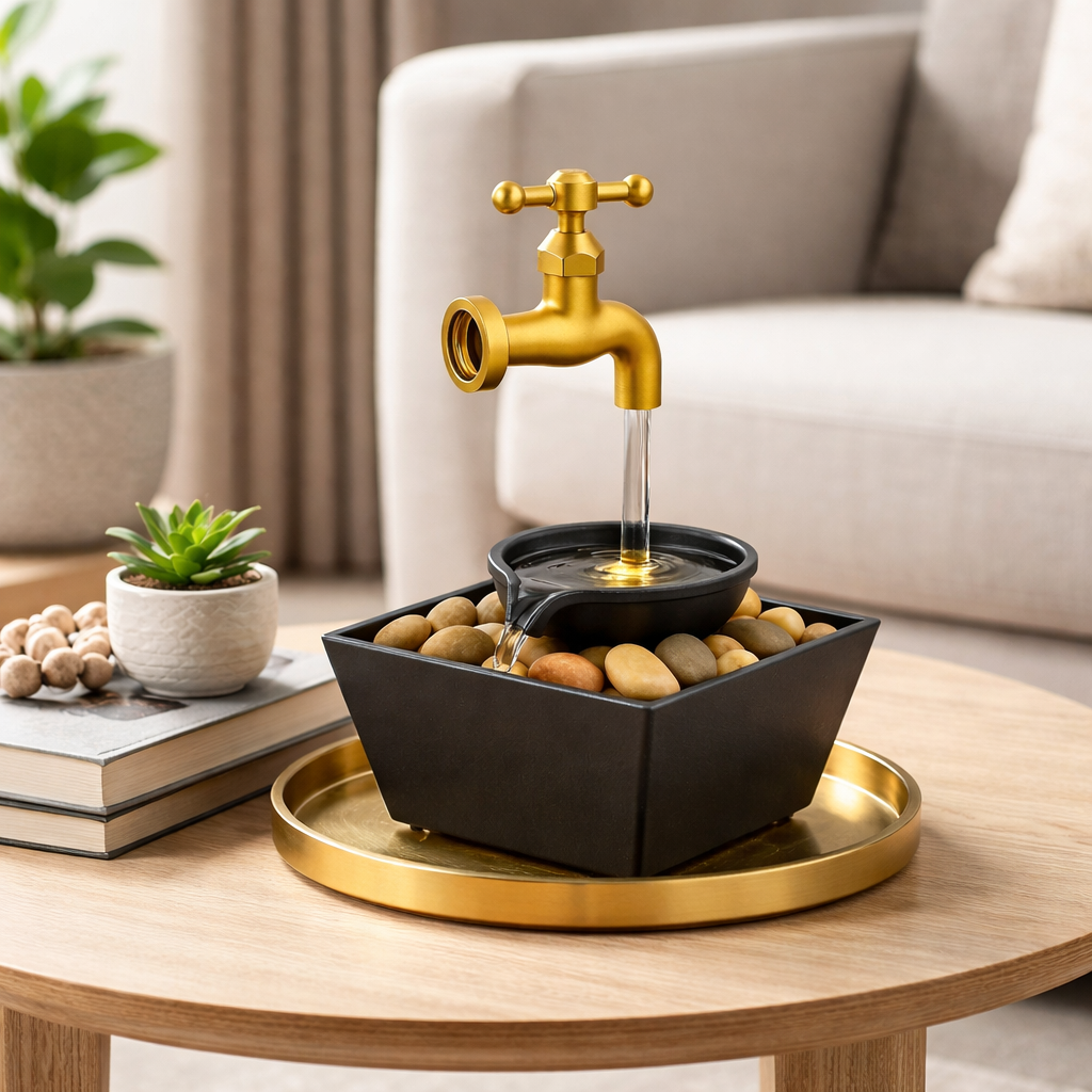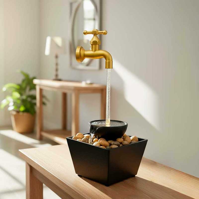 Fantana decorativa cu robinet plutitor si LED Efect vizual spectaculos Include pietre decorative Ajuta la relaxare si concentrare Iluminare LED Efect vizual spectaculos – robinet plutitor. Adauga un element spectaculos si relaxant in casa sau biroul tau cu aceasta fantana decorativa cu robinet plutitor. Designul creeaza iluzia unui robinet suspendat care toarna apa continuu, oferind un efect vizual impresionant si o atmosfera linistitoare. Iluminare LED - Fantana creeaza iluzia unui robinet suspendat care curge continuu, oferind un efect magic si modern. Acest design atrage imediat atentia si transforma fantana intr-o piesa centrala de decor. Include pietre decorative. Fantana vine cu pietre decorative tip river stone care completeaza aspectul natural al apei curgatoare si ofera un decor calm si elegant. Pompa silentioasa. Pompa de apa functioneaza aproape fara zgomot, mentinand o atmosfera linistita. Ideala pentru meditatie, relaxare, yoga sau spatii de lucru. Potrivita pentru orice incapere. Se integreaza perfect in living, dormitor, birou, studio, spatiu de meditatie sau receptii. Dimensiunea compacta permite amplasarea pe birou, masa sau raft. Ajuta la relaxare si concentrare. Sunetul natural al apei curgatoare contribuie la reducerea stresului, imbunatateste concentrarea si creeaza un mediu calmant. Consum redus de energie. Designul eficient energetic permite functionarea pe termen lung cu un consum redus de energie. Usor de instalat si intretinut. Fantana are un sistem simplu de instalare tip plug and play. Doar adauga apa, conecteaza alimentarea si te poti bucura imediat de efectul decorativ.