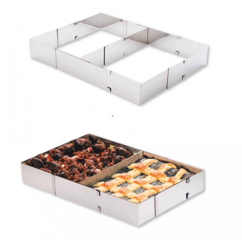 Forma dreptunghiulara pentru tort reglabila Latime reglabila: 18 - 34 cm Lungime reglabila: 28 - 53 cm Inaltime fixa: 5 cm Clemele de pe fiecare parte blocheaza cadrul in dimensiunea dorita. Acest ajutor de bucatarie multifunctional poate fi folosit pentru o mare varietate de retete, de ex. mucegai prajituri si produse de patiserie, cum ar fi pandispan, creme de desert, mousse, placinte, cheesecake, tarte si chiar pizza. Vasul de copt este ideal pentru prajituri de dimensiuni medii dar si pentru creatii XXL si sarbatori de familie de exemplu reuniuni, nunti, cine, zile de nastere, petreceri de Craciun sau orice alte sarbatori cu prietenii si familia. Dupa coacere, puteti folosi vasul de copt ca cadru pentru decorarea prajiturilor, a produselor de patiserie sau a oricarui alt desert. Rama solida pentru tort este realizata 100% din otel inoxidabil si garantat ca nu rugineste. Este usor de curatat si poate fi folosit in frigider si masina de spalat vase. Forma telescopica si reglabila pentru prajituri se poate regla pe lungime pentru a obtine o forma patrat mic, forma patrat mare, forma dreptunghi, si forme intermediare. Forma reglabila telescopica este un produs util, rentabil, ce se poate regla pe lungime si inaltime , poate fi extins sau scurtat, o forma unica ce poate fi transformata, cu usurinta in forme de marimi diferite. Forma poate fi folosita pentru coacere dulciuri, preparate in straturi, mousse-u-ri, deserturi si preparate pe baza de gelatina, produse de patiserie. Forma reglabila poate fi folosita ca forma pentru clatite, taietor pentru prajituri, aluaturi de biscuiti. Forma telescopica este potrivita pentru utilizare in gospodarii casnice, restaurante, cafenele, hoteluri. Forma reglabila are marginile netede si nu raneste mainile, rezistenta la temperaturi ridicate, rezistenta la coroziune, nu este usor de deformat, reutilizabila si usor de curatat. Forma reglabila poate fi ajustata cu usurinta tinand dintr-o parte si tragand din partea opusa spre exterior pentru a se potrivi cu dimensiunea dorita.
