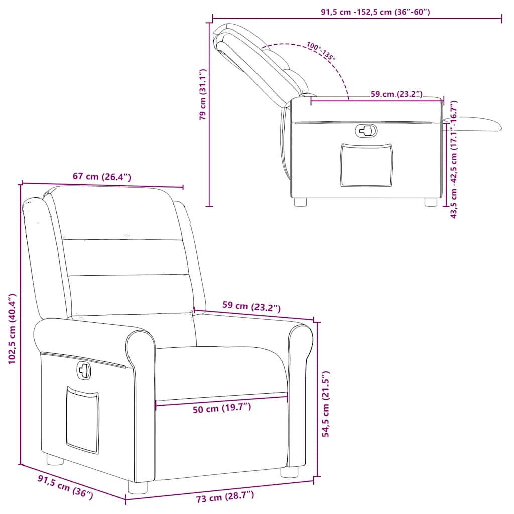 Asezati-va pe spate si relaxati-va in acest fotoliu rabatabil extrem de confortabil! Functie de inclinare manuala: Acest scaun rabatabil are un maner pe partea dreapta. Puteti regla manual suportul pentru picioare si spatarul in orice pozitie, in functie de confortul dvs., printr-o simpla apasare a butonului. Aceasta functie permite o inclinare maxima de 135 de grade. In plus, spatarul poate reveni rapid la locul initial printr-o tragere usoara a manerului.Experienta confortabila a scaunului: Scaunul, spatarul captusit in strat gros si cotierele largi acoperite cu material textil ofera o senzatie confortabila si calda, facandu-va sa va simtiti imbratisat in timp ce sunteti asezat. Tesatura are un aspect simplu si bine definit si este respirabila si durabila.Buzunar lateral convenabil: Acest fotoliu are un buzunar lateral pentru telecomanda sau pentru a va pastra obiectele esentiale la indemana.Cadru solid si stabil: Cadrul din lemn si metal ofera o structura puternica si stabilitate. Acest fotoliu rabatabil este extrem de confortabil si durabil.Culoare: Maro inchisMaterial: Material textil (poliester 100%), metal, placajMaterial de umplutura: Spuma, fibre ppDimensiuni scaun: 73 x 91,5 x 102,5 cm (l x a x h)Dimensiuni culcat: 73 x 152,5 x 79 cm (L x A x A)Dimensiuni sezut: 50 x 59 cm (l x ad.)Inaltime sezut fata de sol: 42,5 cmInaltime cotiera fata de sol: 54,5 cmCapacitate maxima de incarcare: 110 kgAsamblare necesara: Da