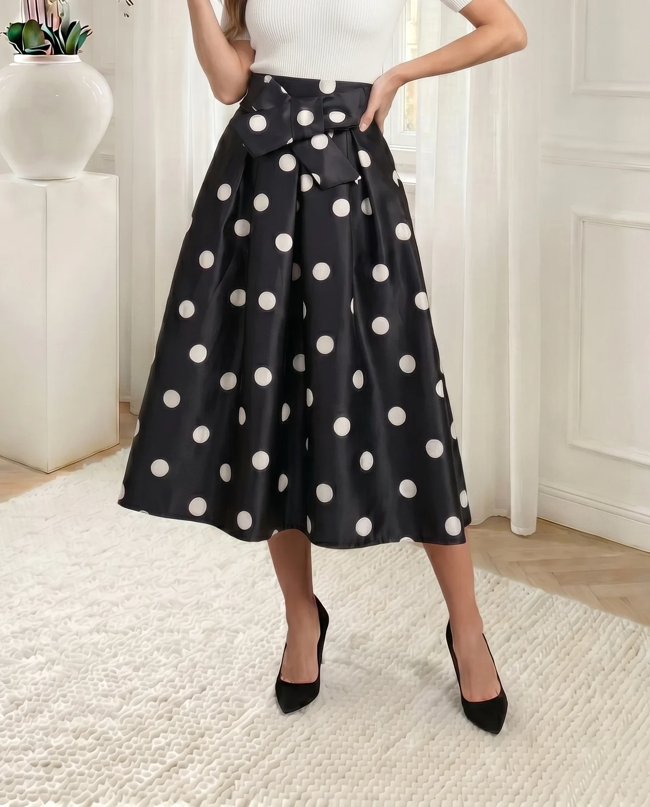 Fusta midi neagra cu buline albe si funda in talie, o piesa clasica si atemporala care emana o eleganta aparte. Contrastul cromatic puternic si croiala ampla in clos transforma fusta intr-un element central al garderobei tale. Funda din talie adauga un pl