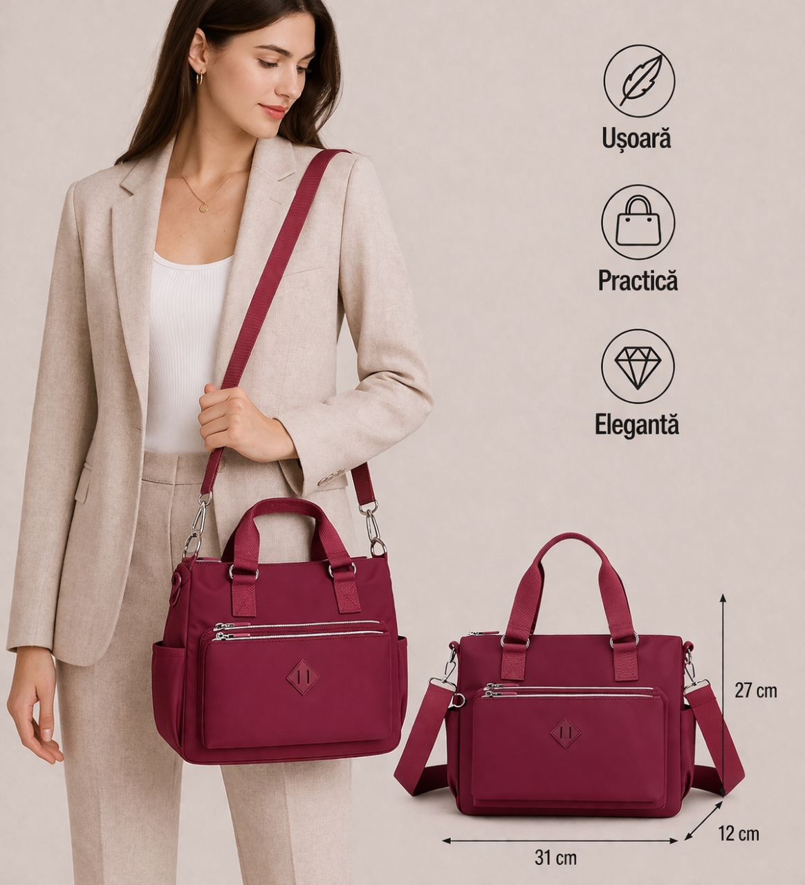 Detalii produs: 1 compartiment principal; 1 buzunar interior cu fermoar; 2 buzunare interioare fara inchidere; 1 buzunar exterior spate cu fermoar; 2 buzunare exterioare fata cu fermoar; 2 buzunare laterale fara inchidere; material: nylon impermeabil; bareta ajustabila si detasabila; dimensiuni: 31 x 12 x 27 cm. Important: Nuanta produsului poate varia usor, datorita luminozitatii monitorului, datorita varietatilor instrumentelor de masura, pot exista usoare erori de cm!