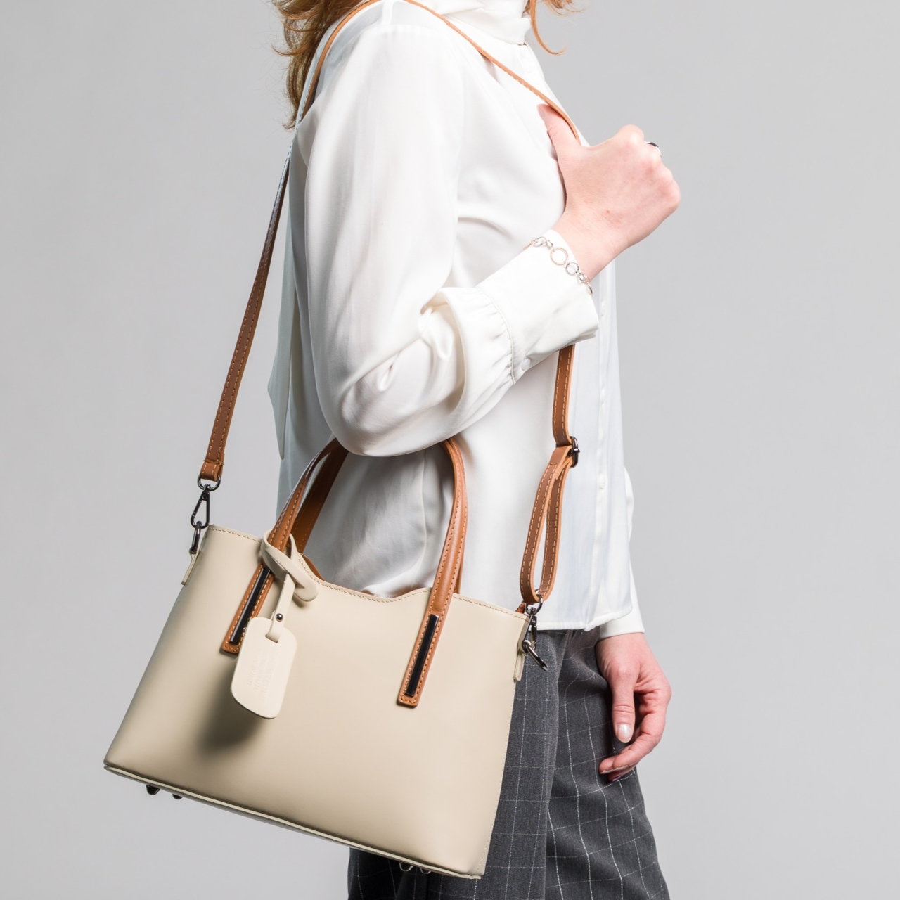 Made in Italy Detalii produs: material - piele naturala; bareta de umar ajustabila, detasabila (piele naturala); doua compartimente principale, separate de un buzunar ce se inchide cu fermoar; la interior doua buzunare mici, dintre care unul se inchide cu fermoar; 2 manere fixe, piele naturala; detaliile metalice - argintii dimensiuni: 32 x 22 x 12 cm; greutate: 0.7 kg; Important: nuanta produsului poate varia usor, datorita luminozitatii mmonitorului, datorita varietatilor instrumentelor de masura, pot exista usoare erori de cm!