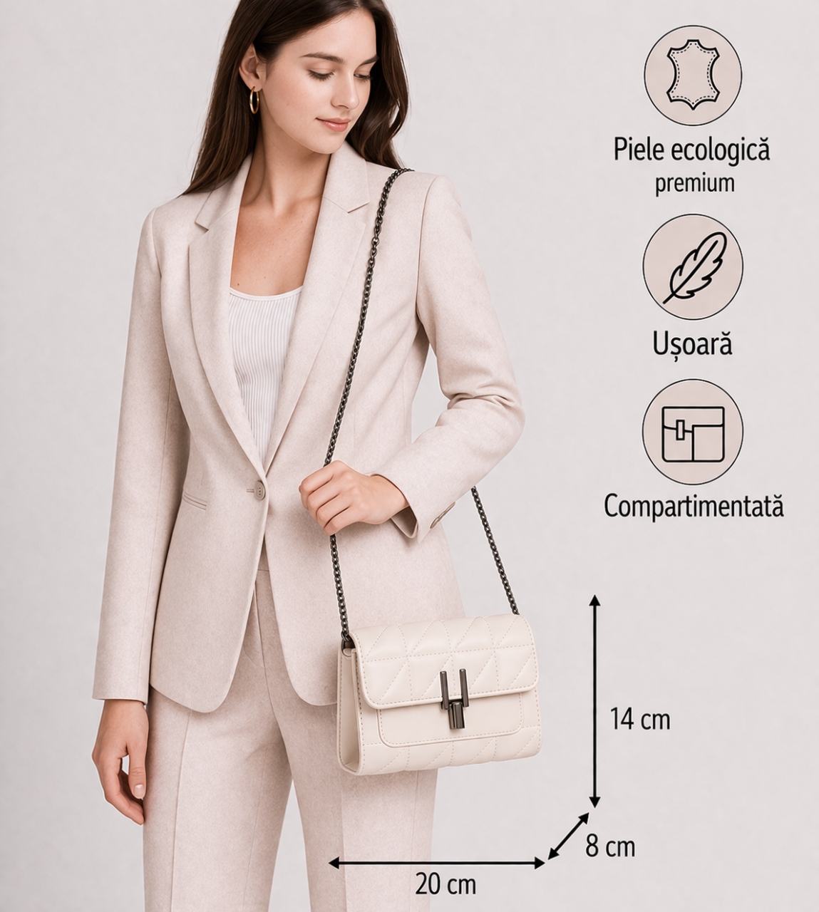Detalii produs: interior captusit; 1 compartiment principal; 1 buzunar separator cu fermoar; 1 buzunar interior fara inchidere; 1 buzunar fata fara inchidere; 1 bareta ajustabila; material: piele ecologica; dimensiuni: 20 x 8 x 14 cm. Important : Culoarea produsului poate varia ușor datorită luminozității monitorului. Din cauza varietății instrumentelor de măsură, pot exista ușoare erori de cm.