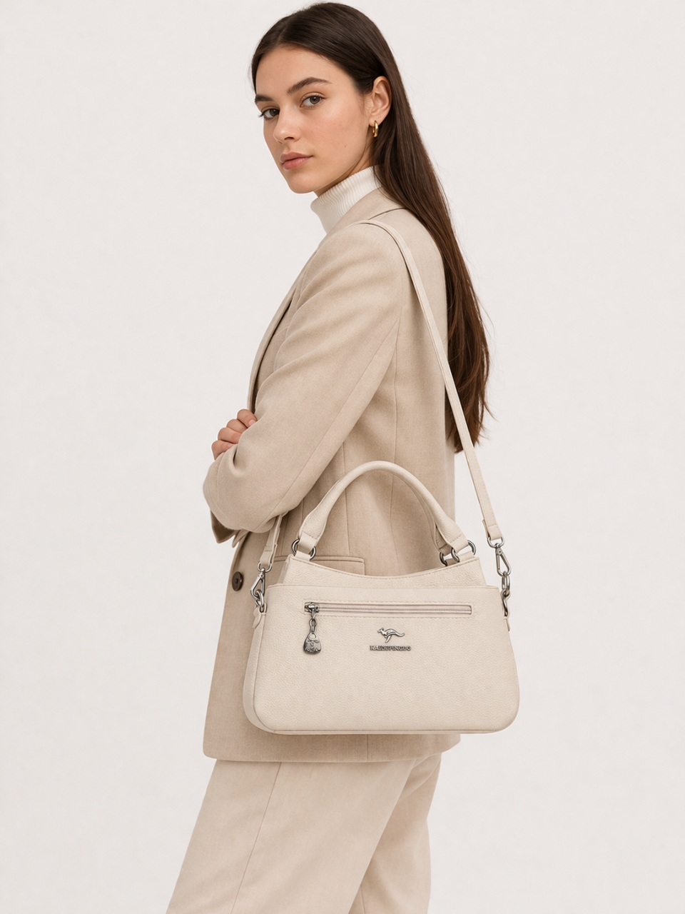 interior captusit; 1 compartiment principal; 1 buzunar interior cu fermoar; 1 buzunar interior fara inchidere; 2 buzunare exterioare fata cu fermoar; 1 buzunar exterior spate cu fermoar; bareta ajustabila si detasabila; material: piele ecologica; dimensiuni: 28 x 10 x 17 cm. Important : Culoarea produsului poate varia ușor datorită luminozității monitorului. Din cauza varietății instrumentelor de măsură, pot exista ușoare erori de cm.