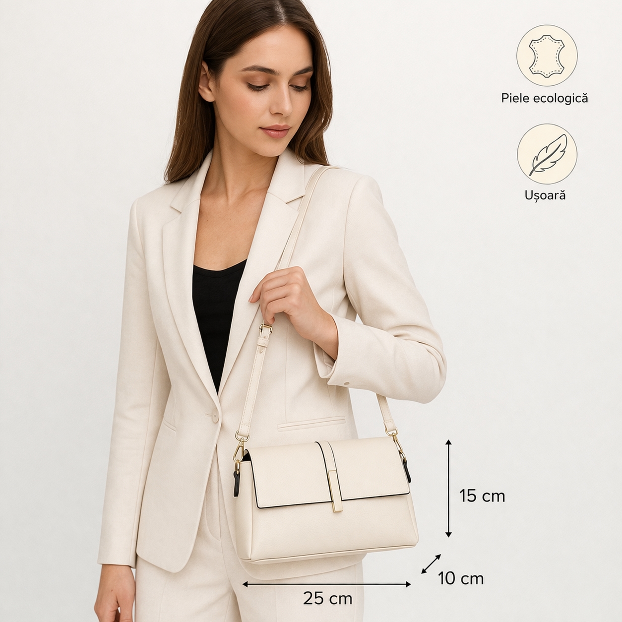 interior captusit; 3 compartimente principale; 1 buzunar interior fara inchidere; 1 buzunar exterior spate cu fermoar; bareta ajustabila si detasabila; material: piele ecologica; dimensiuni: 25 x 10 x 15 cm. Important : Culoarea produsului poate varia ușor datorită luminozității monitorului. Din cauza varietății instrumentelor de măsură, pot exista ușoare erori de cm.