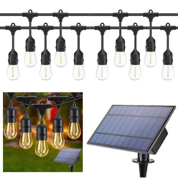 Ghirlanda luminoasa 10 x E27, 10 metri INSTALATIA ESTE INTERCONECTABILA. GHIRLANDA CONTINE BECURILE. Instalatia poate schimba atmosfera din casa sau curtea dumneavoastra, aducand un plus de lumina si bucurie. Gradul de protectie de IP65 asigura rezistenta impotriva prafului si a jeturilor puternice de apa, putand fi astfel folosita, in siguranta, si la exterior. Aceasta are o lungime de 10 metri, este prevazuta cu 10 dulii de tip E27 si se poate echipa cu 10 surse, ce se achizitioneaza separat. Puteti astfel personaliza cu becul, intensitatea luminoasa si temperatura de culoare dorita. Puteti conecta mai multe instalatii, insa puterea totala nu trebuie sa depaseasca 800 W. Instalatia va reflecta lumina intr-un mod placut si va ofera posibilitatea de a va pune in valoare creativitatea si imaginatia in amenajarea oricarui spatiu. Puteti transforma un decor monoton intr-unul special si primitor, ideal pentru momentele petrecute in familie sau intre prieteni. Utilizare - interior si exterior 10 metri lungime Cablu cu 10 becuri Telecomanda inclusa 8 jocuri de lumini Indicator de baterie Intrare USB C pentru alimentare normala Lungime pendul 12 cm Becurile sunt incluse Tip dulie E 27 Putere bec: 2 W Culoare LED: alb cald 10 becuri LED cu filament Panou solar 22 cm x 13 cm Mai mult, ghirlanda functioneaza de la -30 de grade si pana la +50 de grade, ceea ce inseamna ca o poti folosi pe tot parcursul anului. Cu o lungime de 10 metri, cablul are 10 pendule cu dulie E27 dispuse la o distanta de 1 metru unele de altele. Lungimea unui pendul este de 12 cm. Ghirlanda dispune de un sistem special care va iti permite sa unesti mai multe ghirlande in sir (nu mai mult de 50 metri). De asemenea, fiecare pendul este dotat cu cate o agatatoare, utila pentru fixare.