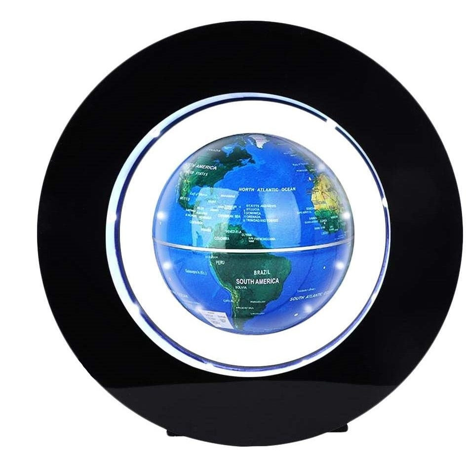 Glob pamantesc magnetic cu levitatie si lumini Functioneaza pe baza unui electromagnet si un senzor computerizat ascuns in standul suport. Acesta actioneaza asupra globului Pamantesc si ii permite acestuia sa leviteze pur si simplu in aer si chiar sa se invarta in jurul propriei axe. Globul Pamantesc are incorporat in suportul sau o lumina LED colorata ce poate fi observata mai bine atunci cand este intuneric. Poti chiar sa treci mana in jurul globului fara sa-i intrerupi levitatia. Este usor de instalat, iar imediat ce l-ai pus in pozitie, poti sa-l rotesti si sa observi cum isi continua miscarea pe o perioada extinsa de timp. Globul LED plutitor este colorat, practic, avangardist, cu design inovator, poate fi folosit acasa sau la birou, si poate fi un cadou perfect. dimensiuni rama: 18,1 x 18,1 x 4,1 cm diametrul globului: 8,5 cm putere: 2.0 W intrare: AC 100-240V 50-60Hz iesire: DC12V 1000mA