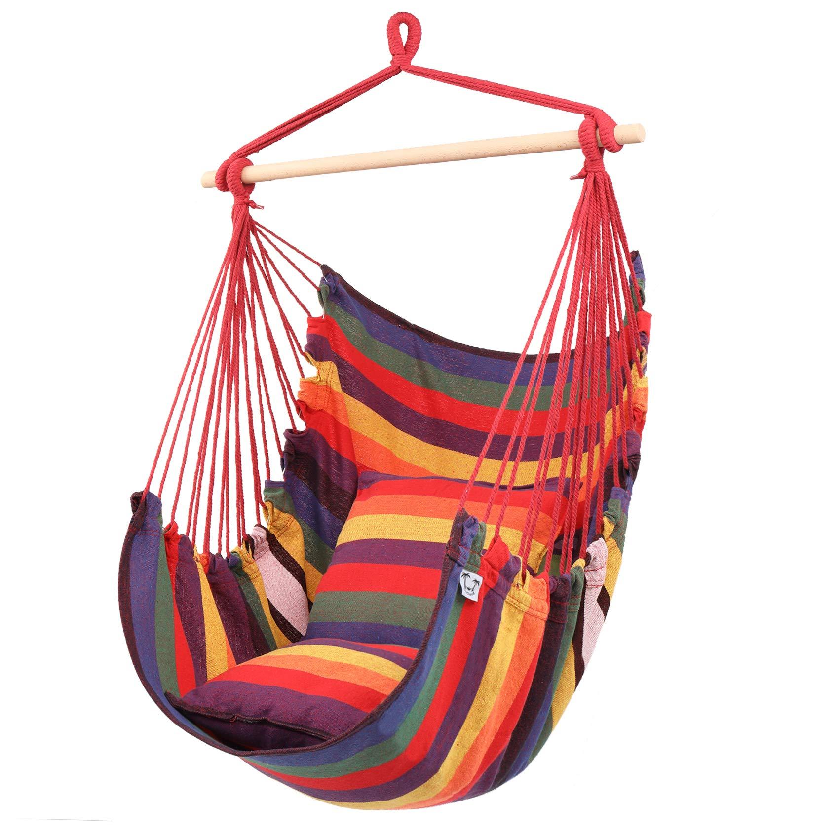 Hamac tip scaun cu bara de lemn 130 x 98 cm Hamac tip scaun foarte confortabil, functional si util in orice gradina, pe un teren sau pe balcon. Este un ragaz perfect pentru un corp obosit, relaxare perfecta. Trebuie doar agatat in gradina sau terasa si va puteti astfel, bucura de aerul curat si de odihna. Hamac suspendat tip scaun Scaun confortabil, mare, suspendat Material respirabil Corzi groase impletite Franghie pentru atarnarea scaunului De ce scaunul suspendat? Visezi o odihna de vara in gradina sau pe terasa? Nu este nimic mai bun decat un scaun brazilian. Este suficient sa-i suspendati capatul unui copac sau sa utilizati un cadru optional pentru a va bucura de activitati in aer liber. Nu ai gradina? Scaunul nostru poate fi folosit cu succes pe terasa, balcon si chiar in apartament. Cea mai buna calitate - Scaunul suspendat este fabricat dintr-un material respirabil placut la atingere, care este, de asemenea, durabil si rezistent la abraziune. In plus, franghiile tesute foarte gros garanteaza ca scaunul va va servi multe sezoane. Specificatii: Sarcina maxima: 150 kg Greutate: aprox 1,1 kg Material: 65% Bumbac / 35% Poliester Lungimea hamacului: 130 cm Latimea hamacului: 98,5 cm Bara de lemn inclusa Pernele nu sunt incluse