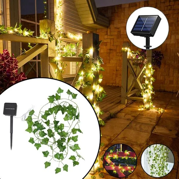 Instalatie solara tip iedera 7 Metri 50 LED / 12 Metri 100 LED Instalatia solara cu frunze artificiale de iedera cu LED-uri adauga o atmosfera placuta si confortabila gradinii tale. Aceste instalatii frumoase pot fi folosite atat in interior, cat si in exterior – pur si simplu agatati-le in jurul terasei, balconului, gardului sau peretilor. Decor pentru casa si petreceri Frunze de iedera realiste care nu se ofilesc Rezistenta la intemperii Instalatie cu LED-uri alimentate cu energie solara Auto On la intuneric cand porniti instalatia, Auto Off pe timp de zi. Proiectate cu un panou solar reglabil si o baterie reincarcabila, aceste instalatii solare pot functiona continuu mai mult de 8-10 ore pe timp de noapte, odata ce sunt complet incarcate in timpul zilei. Instalatia vine preasamblata si gata de utilizare, fara a fi nevoie de unelte sau instructiuni complicate. Asigurati expunerea directa la lumina soarelui pentru reincarcare si utilizare optima pe timp de noapte.