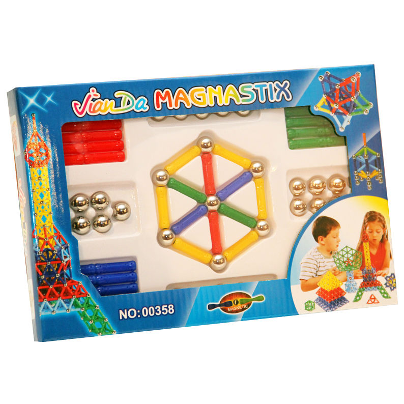 Joc creativ pentru copii, Magnastix 84 piese Set de constructie compus din magneti, bile metalice. Jocul permite combinarea pieselor astfel incat sa se poata construi nenumarate structuri geometrice. Stimuleaza creativitatea, dezvoltata abilitatile manuale, logica, capacitatea de analiza. Ajuta la vederea in spatiu si la intelegerea fortei magnetice din fizica, forta magnetica fiind o alta forta fundamentala a universului pe linga cea gravitationala. Este potrivit pentru copii de toate varstele incepand de la 3 ani. Contine 84 de piese: 52 tije magnetice (albastru, galben, verde) 32 bile de metal (cromate)